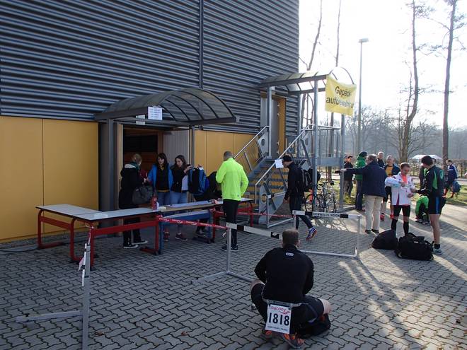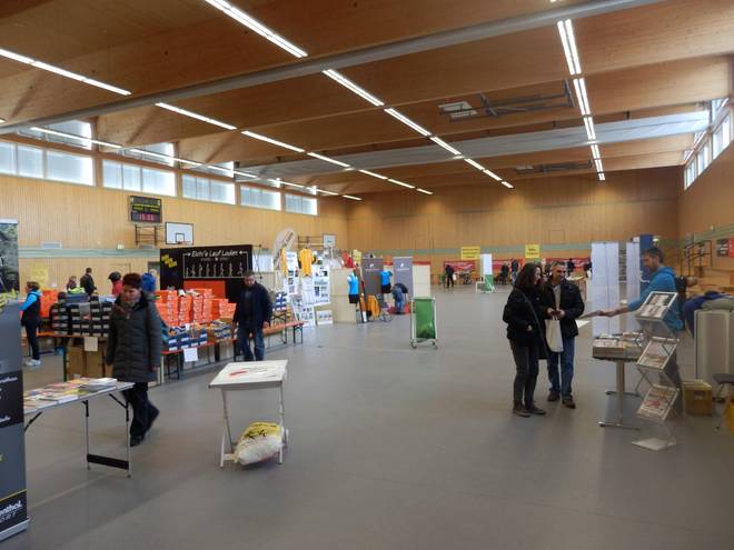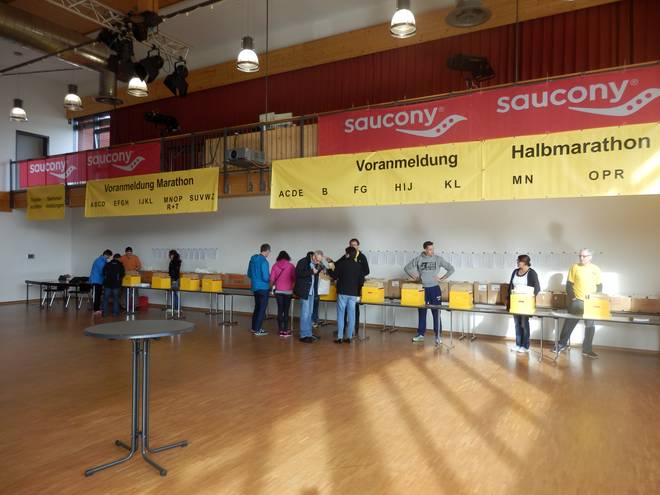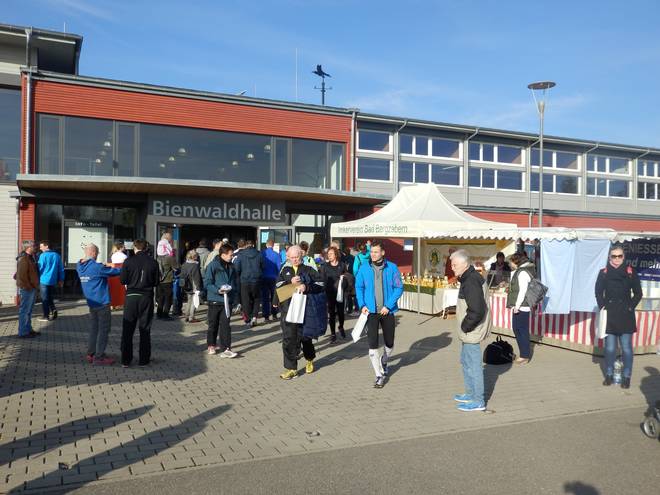 Bienwaldhalle Anders als noch am Vortag gab es nun längere Wartezeiten bei der Startnummernausgabe. Aber auch der Stand mit den Nachmeldungen war gut besucht. |