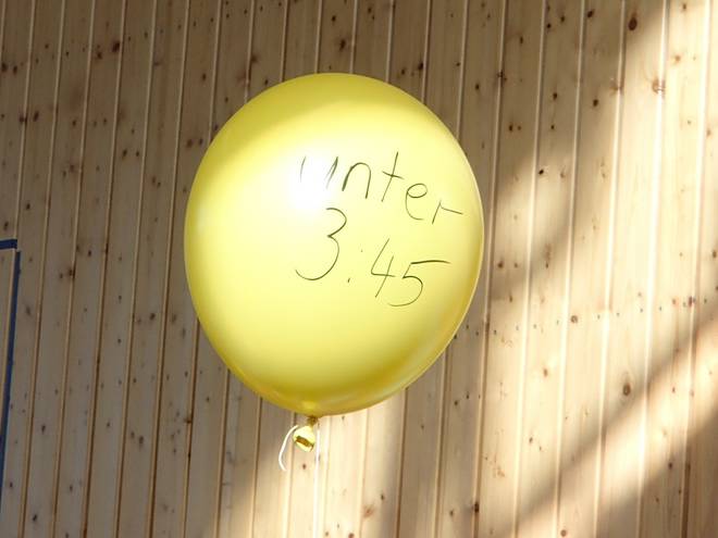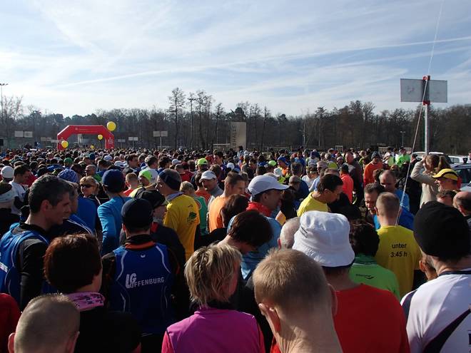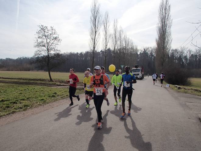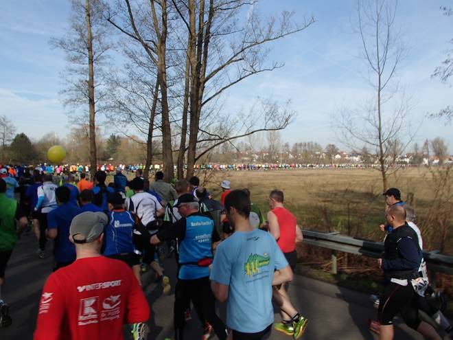 Hubhofweg Kandel 10.03 Uhr / Km 0,2 Und los ging es. Ich lief gleich mal in Sichtweite der 3:45-Stunden-Ballons. |