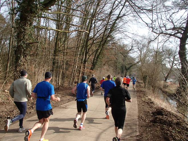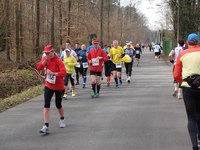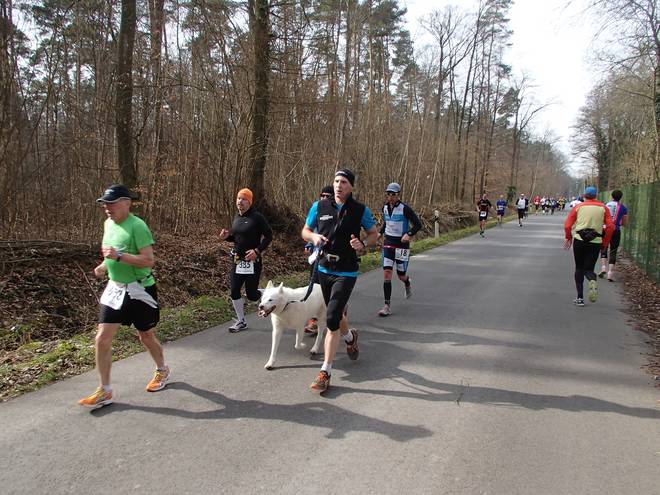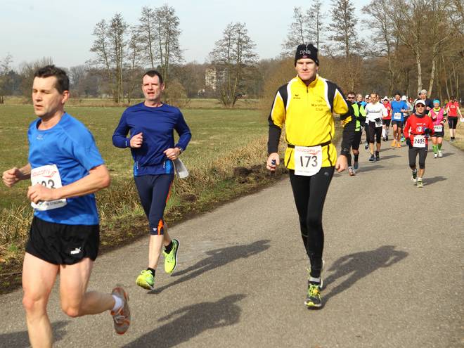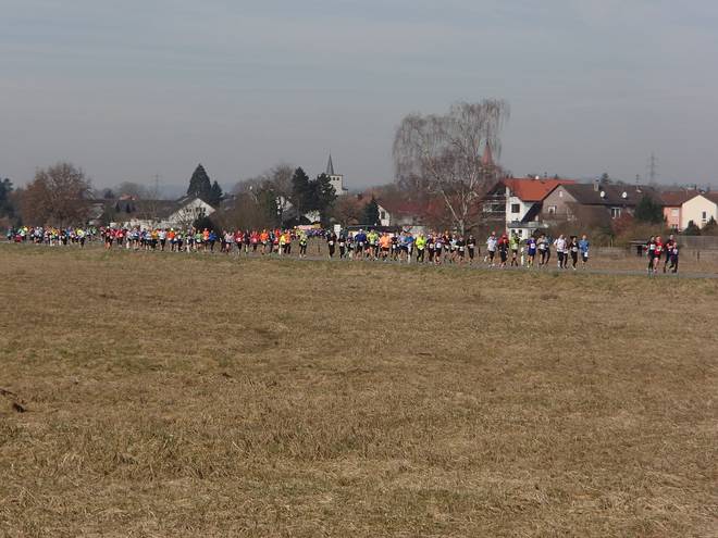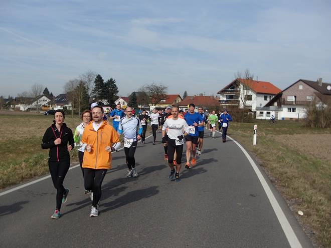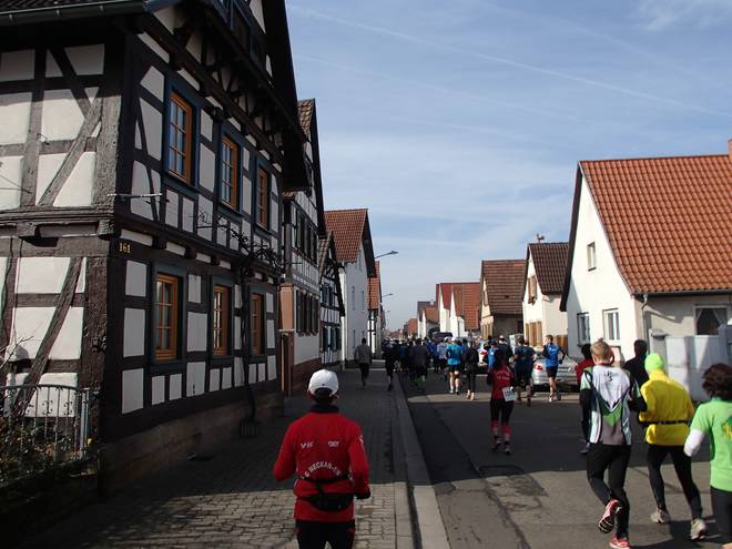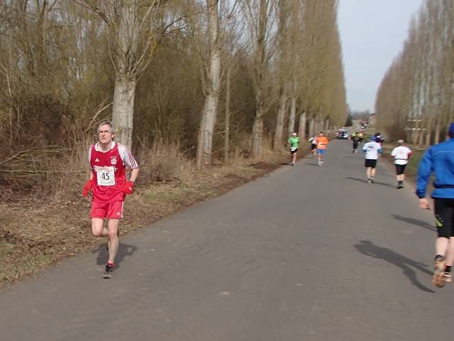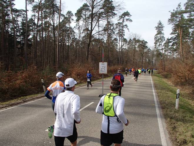 Im Leisengarten Minfeld 10.30 Uhr / Km 5,2 Sehr viele Läufer in kurzer Hose. Dabei war es auch jetzt kaum mehr als 5°C. Aber ich hatte mich nun warm gelaufen. Ich hatte ja auch genug Klamotten an. |