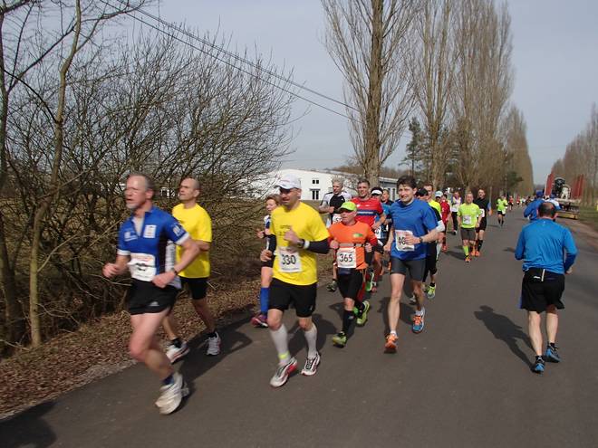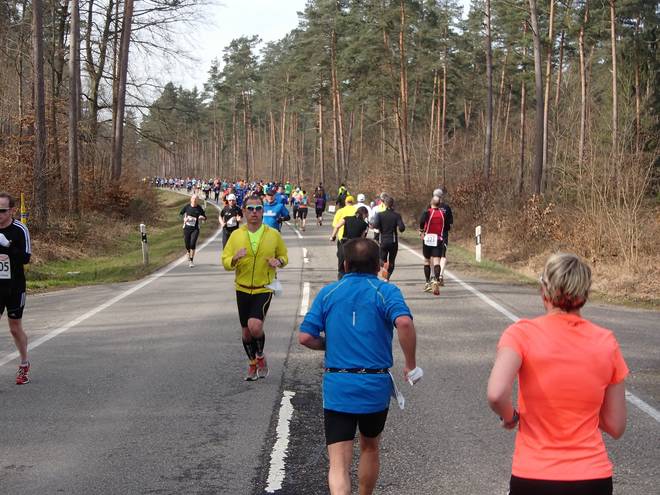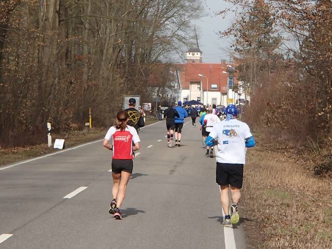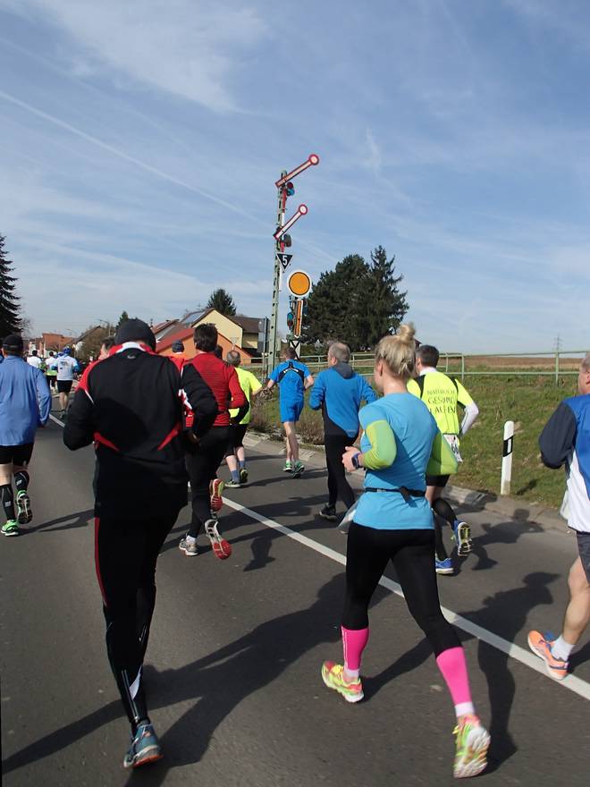 Pappelallee Schaidt 11.31 Uhr / Km 17,3 So allmählich näherten wir uns dann dem ersten Wendepunkt. Mir kamen hier schon die 3:30-Stunden-Läufer entgegen. |
