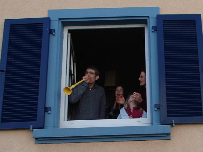Holzgasse / K16 Minfeld 10.24 Uhr / Km 4,5 Lautstarke Fans. Sehr viele gab es zwar nicht und noch weniger unten auf der Straße, aber immerhin. |