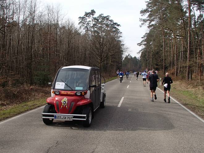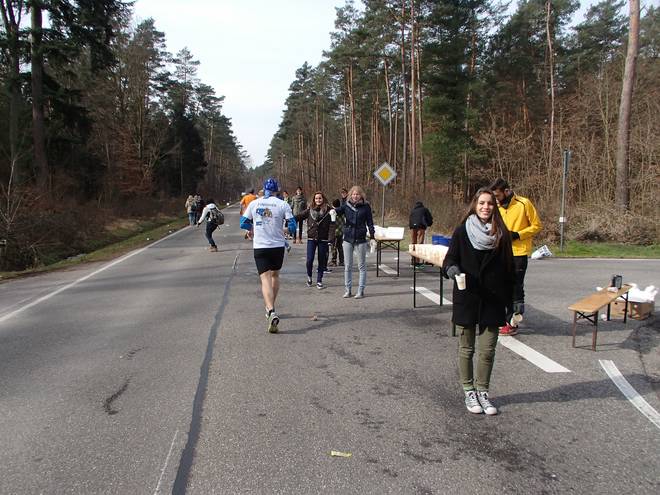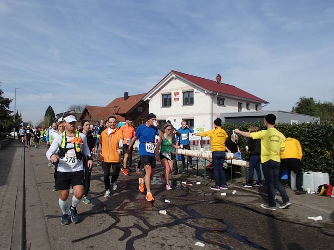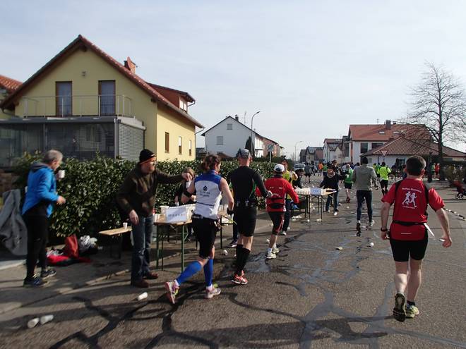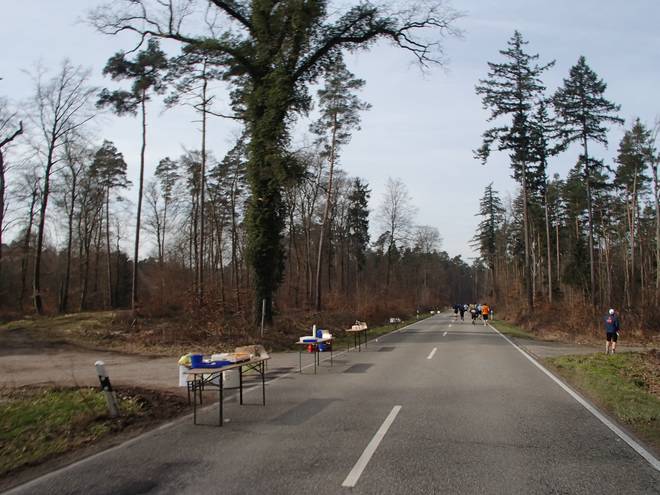 Im Leisengarten Minfeld 10.30 Uhr / Km 5,2 Auf der Strecke gab es neun Verpflegungsstellen, wobei man bei zweien davon jeweils zweimal zugreifen konnte. Das machten die Sackgassen auf der Strecke aus. |
