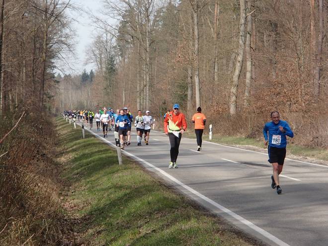 K15 11.39 Uhr / Km 19,0 Und nun ging es gänzlich unspektakulär die K15 wieder zurück. Auf der Gegenseite die 4:15-Stunden-Läufer. |