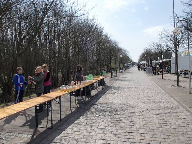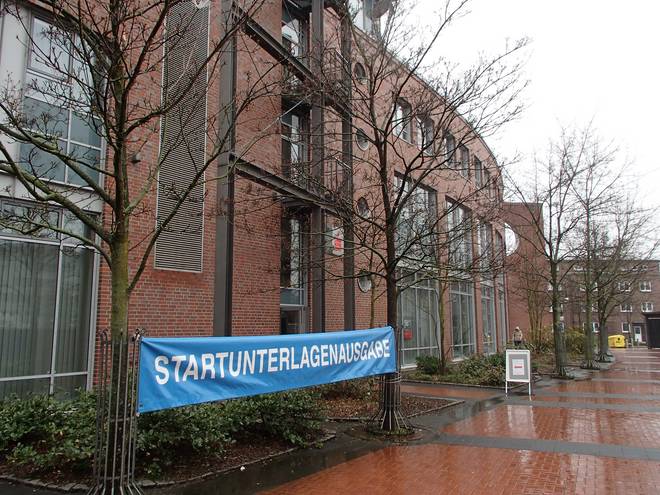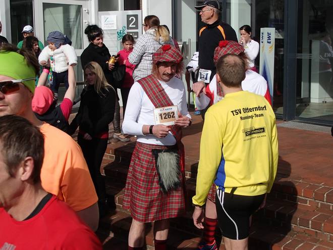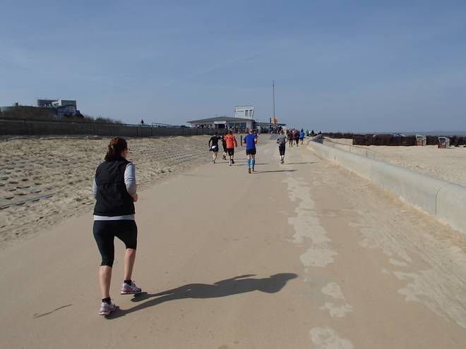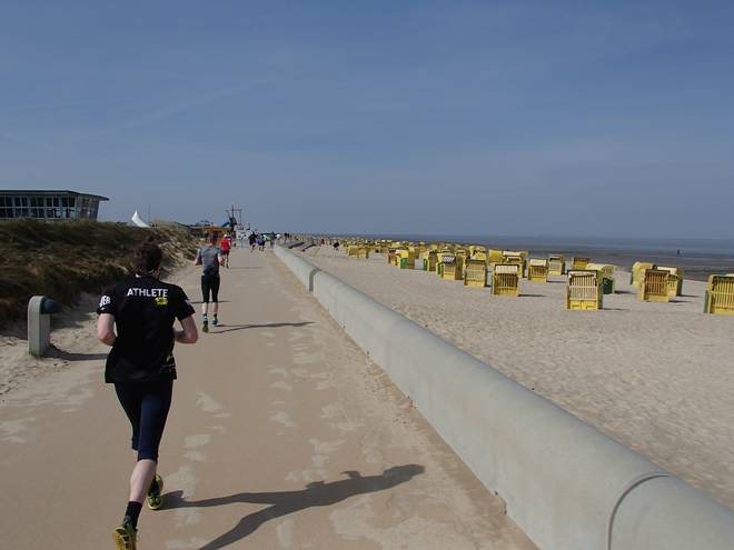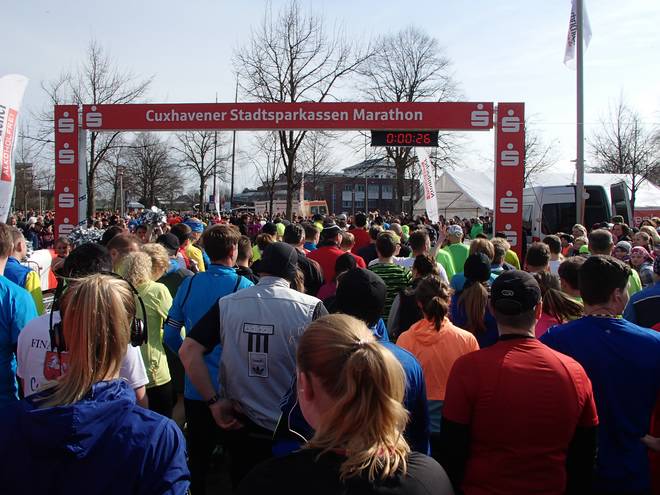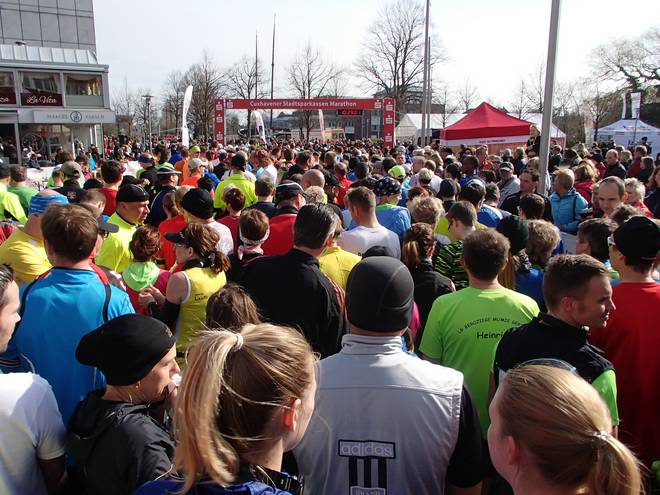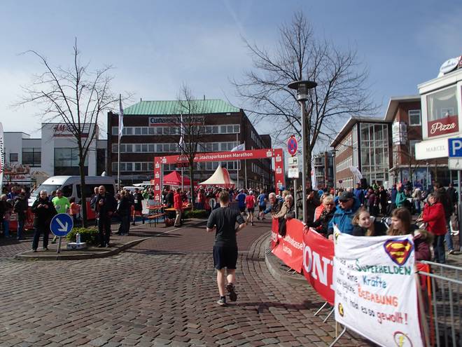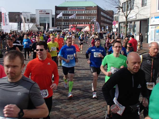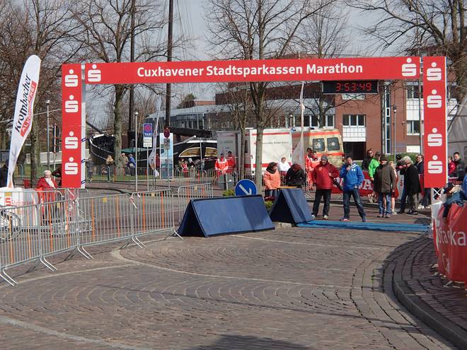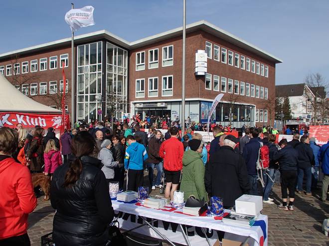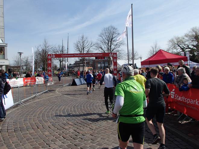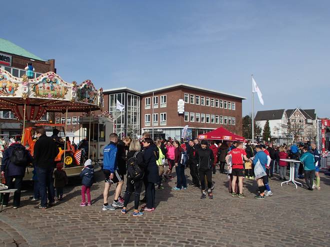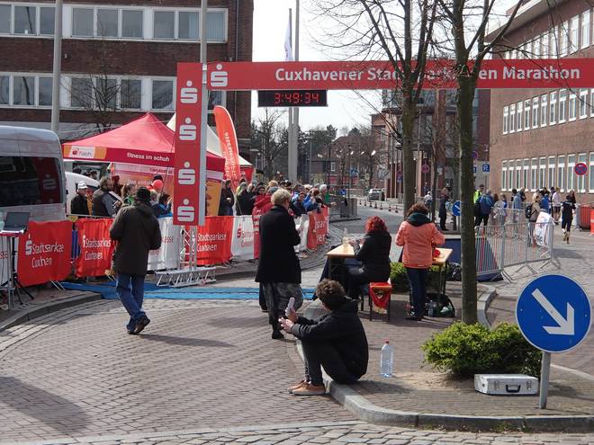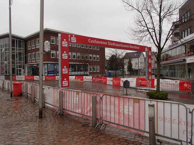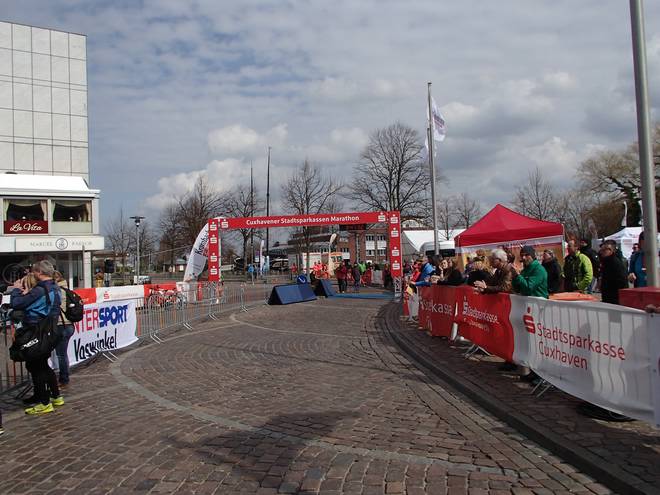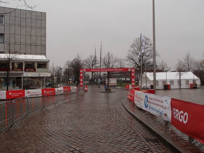Kaemmererplatz 10.10 Uhr Der Wetter kam nicht überraschend. Es war sonnig, kalt, windig. Das ist so üblich für den Marathon in Cuxhaven wie der Regen am Tag davor. |