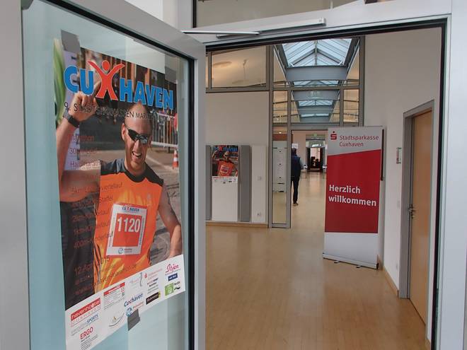 Stadtparkasse Cuxhaven 17.32 Uhr Es lief wie immer. Die Startunterlagen gab es schnell und problemlos, dann meldete ich mich noch rasch für das nächste Jahr an und fertig. Und es wäre noch schneller gegangen, wenn ich nach dem Bezahlen nicht das T-Shirt liegengelassen hätte. |