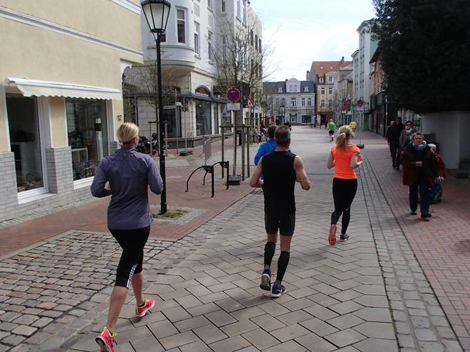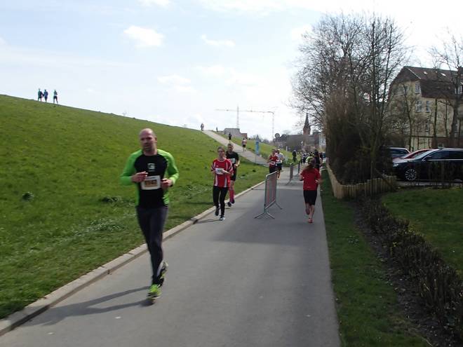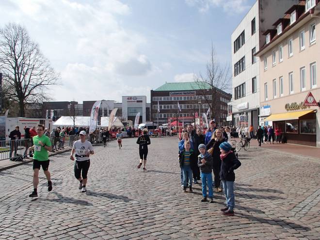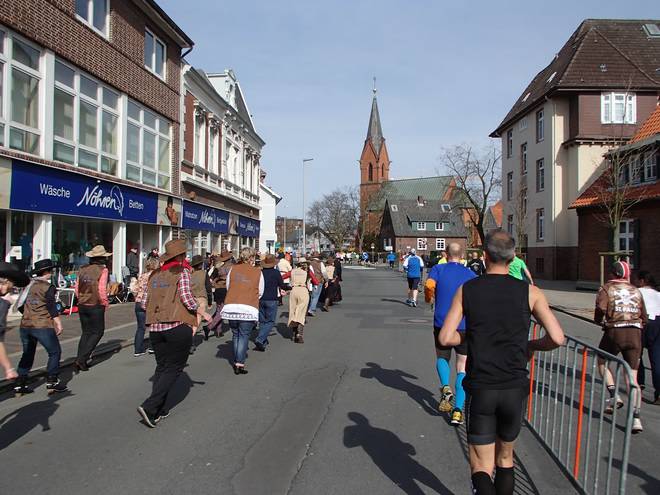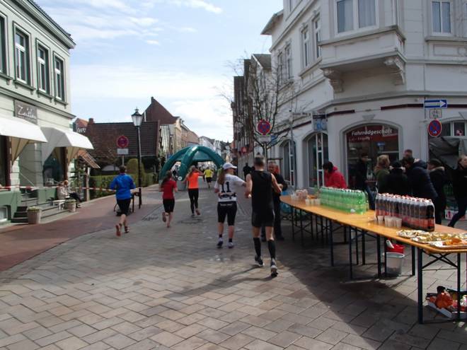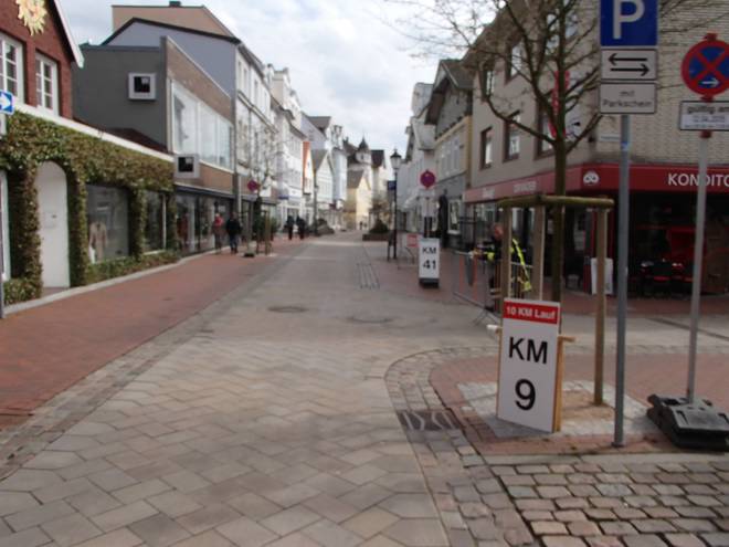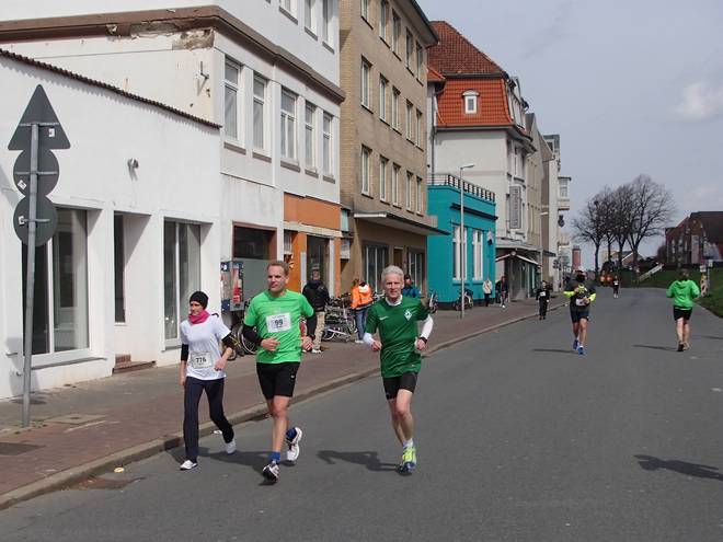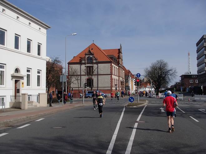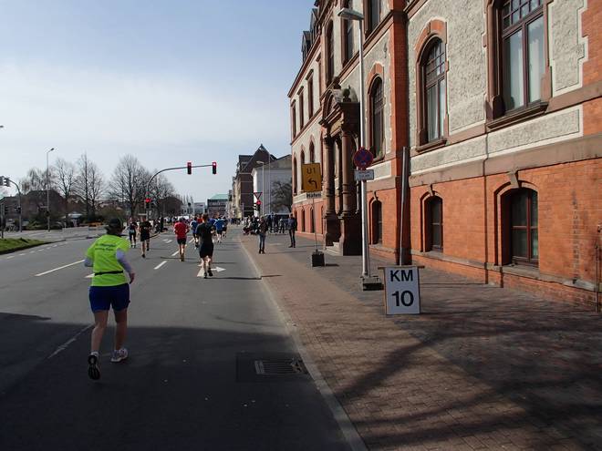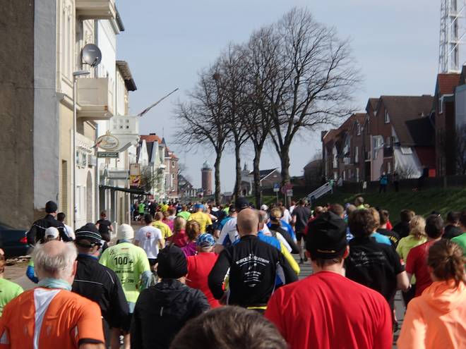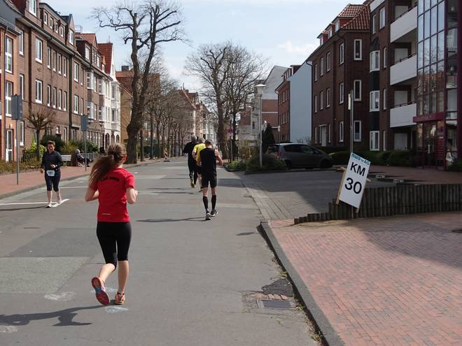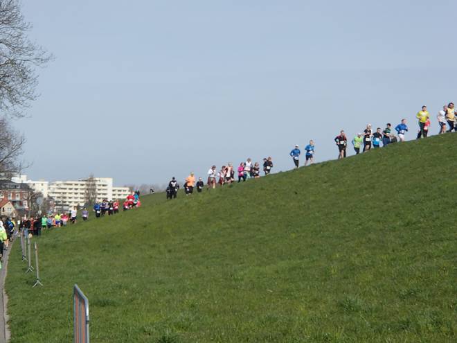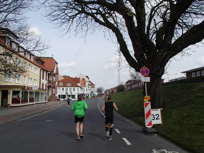 Deichstraße Runde 2 11.29 Uhr / Km 10,7 Mit etwas mehr Platz ging es hinein in die zweite Runde. Die 10-Km-Läufer waren jetzt ja raus. |