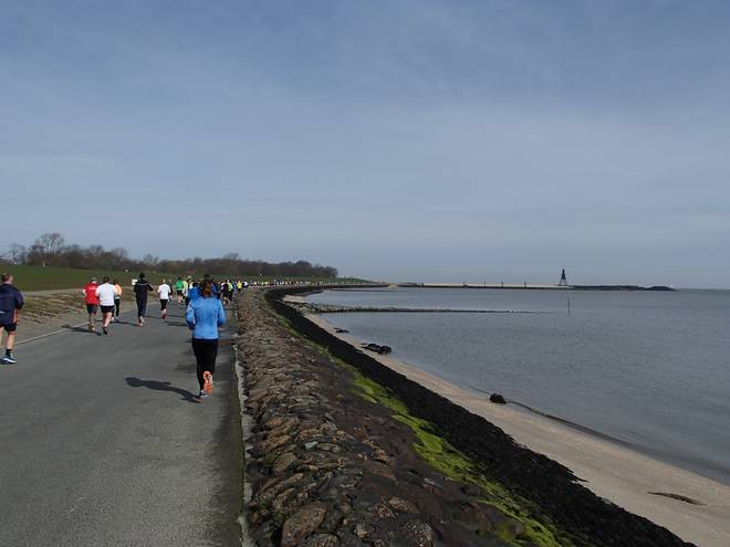 Döser Seedeich Runde 3 13.11 Uhr / Km 29,3 Nun wurde es kurzfristig wieder voller auf der Strecke, denn ich traf auf die Läufer des 5-Km-Laufes, die um 13.00 Uhr am Kaemmererplatz gestartet waren. |