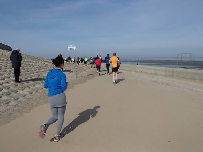 Steinmarner Seedeich Runde 2 11.57 Uhr / Km 15,8 Typisches Cuxhavener Marathon-Wetter. Sonne. Kalt. Wind. Immerhin mal kein Sturm. |
