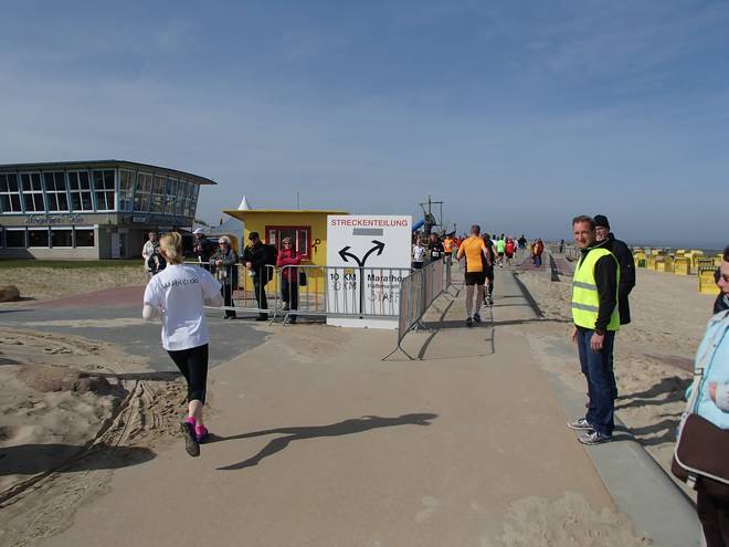 Strandhaus Döse Runde 1 10.59 Uhr / Km 5,3 Die Marathonläufer und die Halbmarathonläufer gingen hier in eine kleine Extraschleife geradeaus. Die 10- und 30-Km-Läufer konnten gleich nach links über den Deich. |