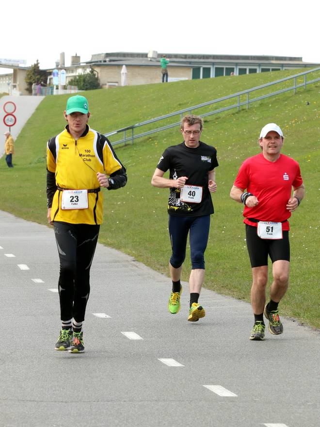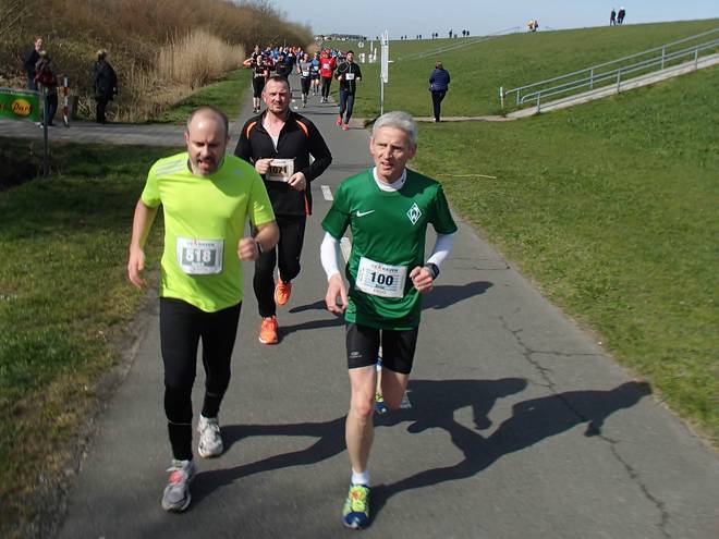 Steinmarner Seedeich Runde 1 11.04 Uhr / Km 6,0 Im Werder-Trikot hätte ich auch laufen können. Am Freitag hatte ich mir eines gekauft. Für den Hamburg-Marathon. Aber ich hätte es ja auch in Cuxhaven tragen können. |