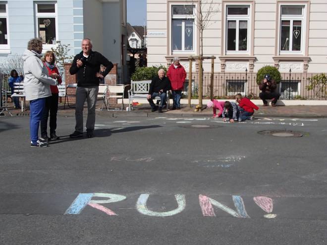 Catharinenstraße Schillerstraße Runde 2 12.18 Uhr / Km 19,5 Motivierende Malerei auch von der anderen Seite. |