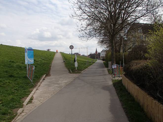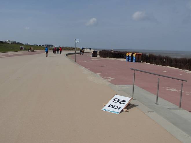 Deichstraße Runde 1 11.26 Uhr / Km 10,0 55:12 Minuten für die ersten zehn Kilometer. Nur 12 Sekunden langsamer als der Plan, aber aus der Vergangenheit weiß ich, dass die Kilometerschilder nicht so genau platziert sind. |