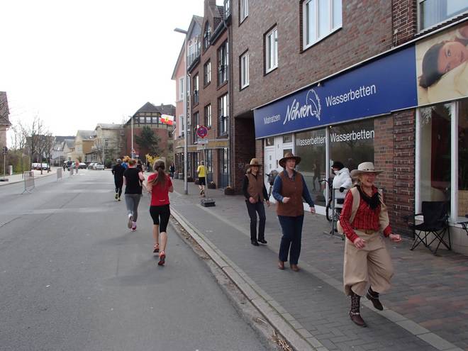 Strichweg Runde 3 13.14 Uhr / Km 29,8 Drei Western-Tänzer waren immer noch da. Starke Leistung. |