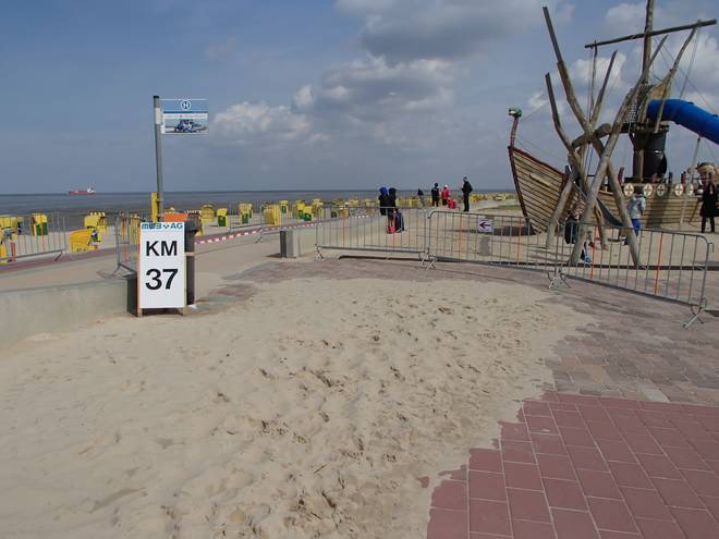 Strandhaus Döse Runde 4 13.53 Uhr / Km 37,0 Der Kilometer 37, ab dem ich das Tempo loslassen wollte. Im Schnitt 5:30 Min/Km hätte ich hier bei 3:23:30 Stunden sein sollen. Tatsächlich kam ich schon bei 3:23:03 Stunden vorbei. An dem Standort des Schildes im Jahr 2014 (bei identischer Strecke) kam ich allerdings erst bei 3:23:43 Stunden vorbei. |
