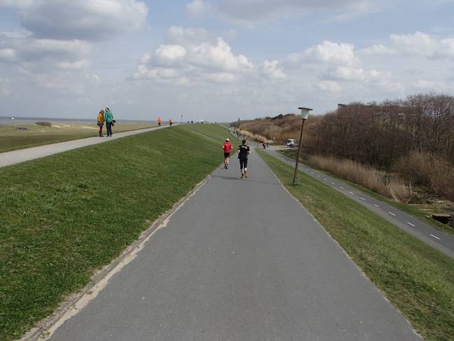 Döser Seedeich Runde 1 10.41 Uhr / Km 2,0 Und wie jedes Jahr ging es je Runde zweimal über den Deich. Einmal hier und dann später am Strandhaus Döse. |