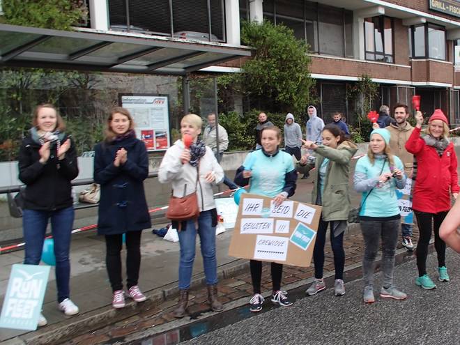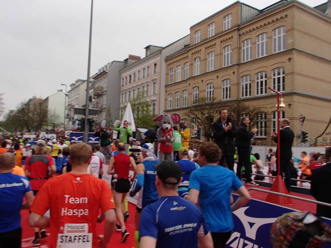 Karolinenstraße 9.01 Uhr / Km 0,01 Und los ging es. Rechts Seite sind noch die Glocke und unser Bürgermeister Olaf Scholz zu sehen.. Etwas weiter links gab es Anfeuerungen von der Maus. |