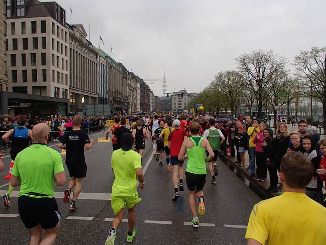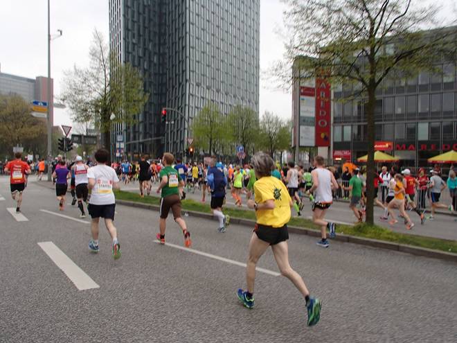 Neuer Jungfernstieg 10.11 Uhr / Km 16,7 Praktischerweise kamen genau jetzt etliche neue Staffelläufer ins Feld. Von denen waren einige sehr langsam, was auf dem her engen Kurs zusätzlich Probleme machte. |