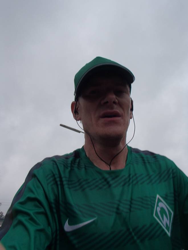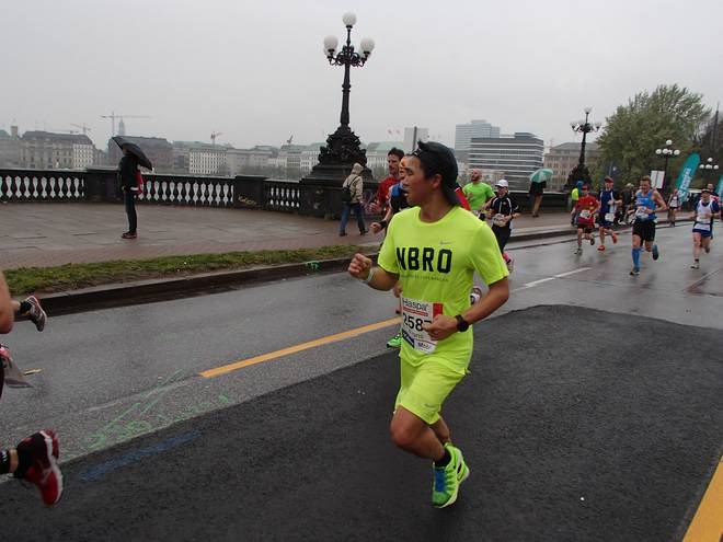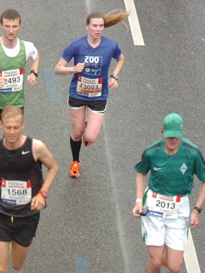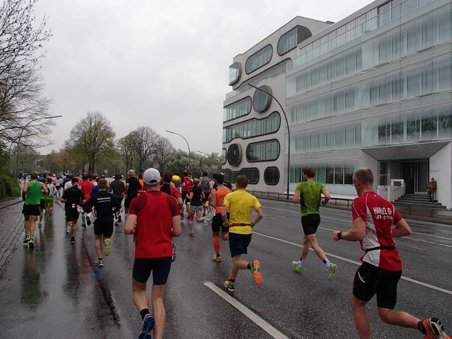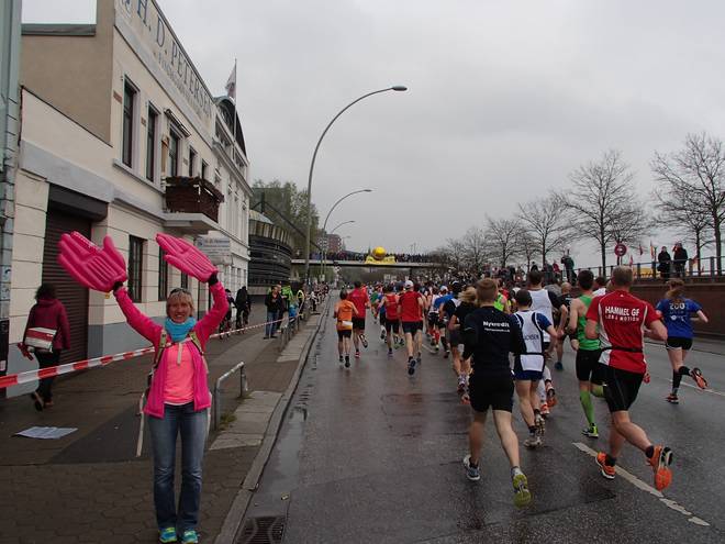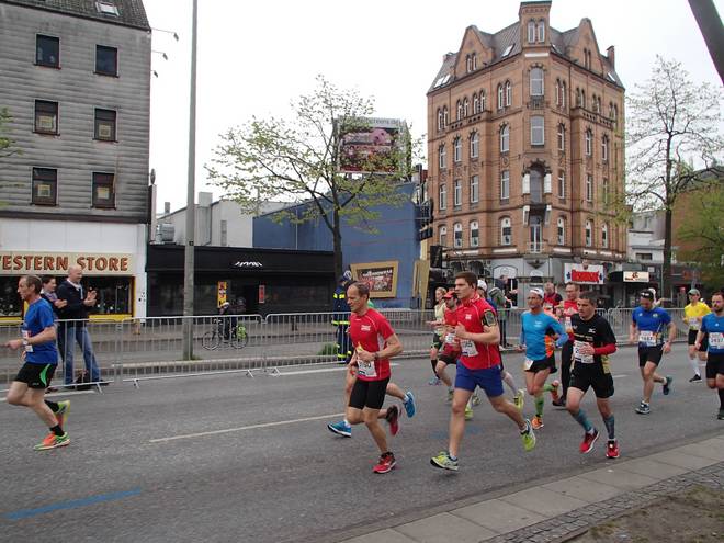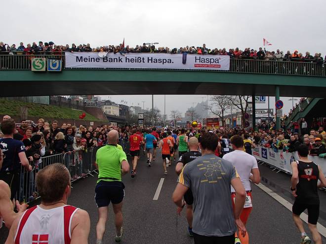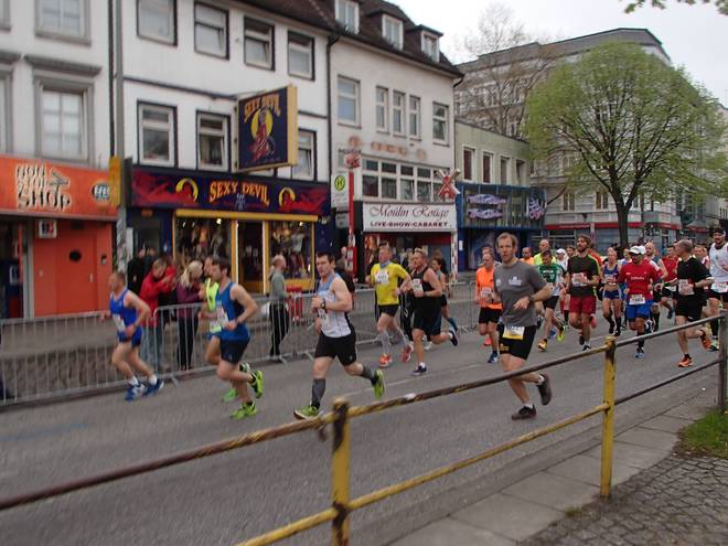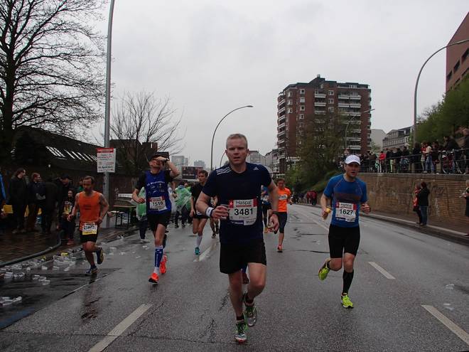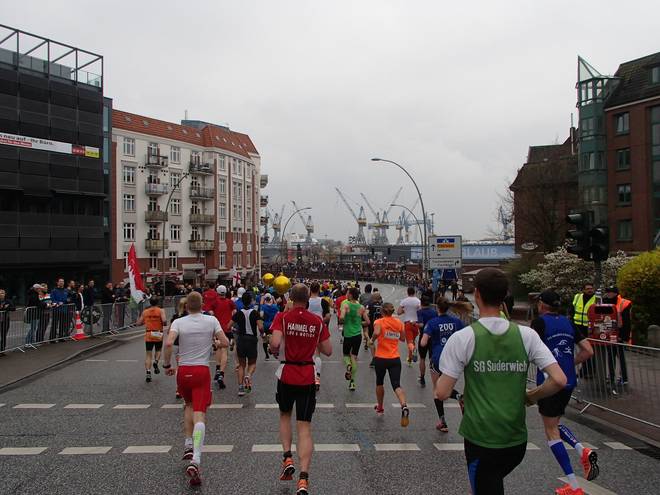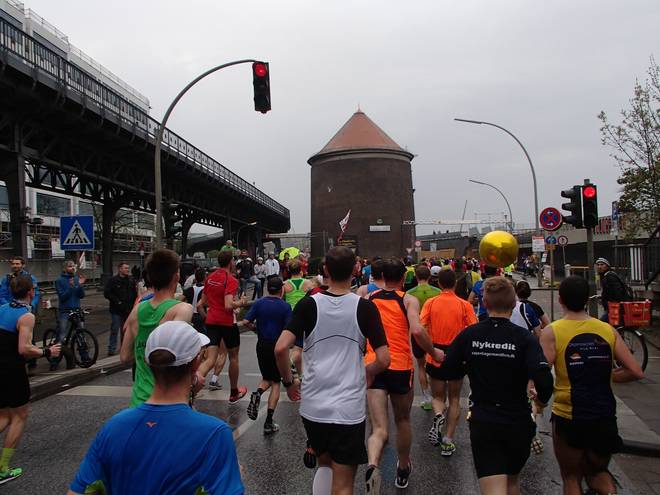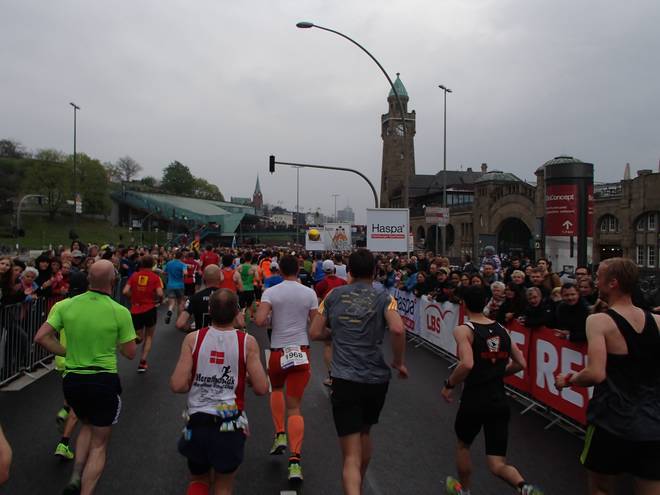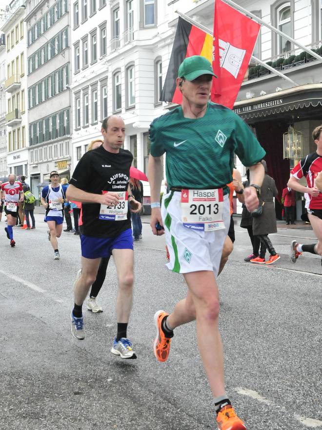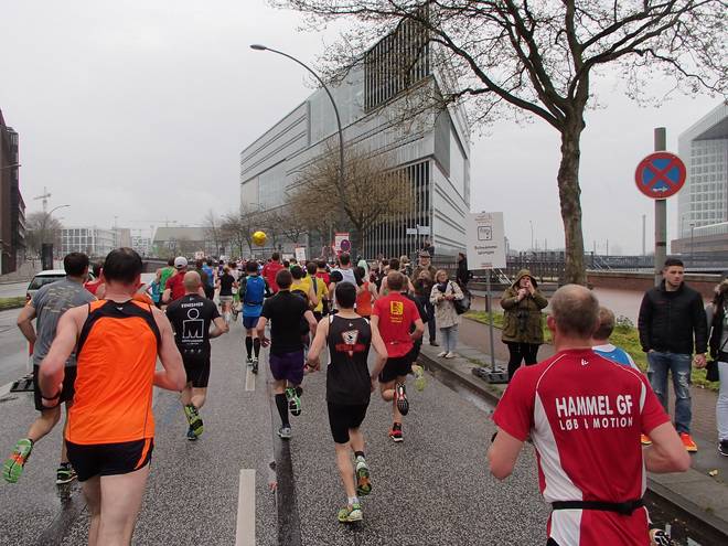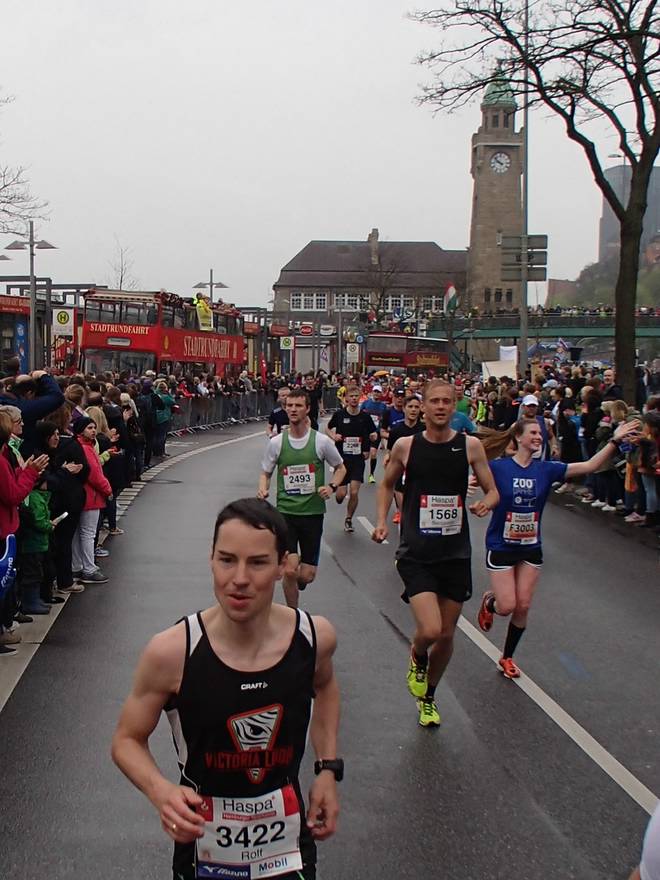 Bei den St. Pauli Landungsbrücken 9.52 Uhr / Km 12,0 Ja, ich bin der Läufer unten rechts. Ich hatte es tatsächlich gewagt, mit einem Werder-Bremen-Trikot durch Hamburg zu laufen. Aber wenn ich mich schon auf machte, dem Marathon meiner Heimatstadt (Bremen) die persönliche Bestzeit (Bremen-Marathon 2014) abzunehmen, dann wenigstens im Bremen-Outfit. Und zumindest die St. Pauli-Fans hatte ich alle auf meiner Seite. Foto: www.marathonfoto.com |