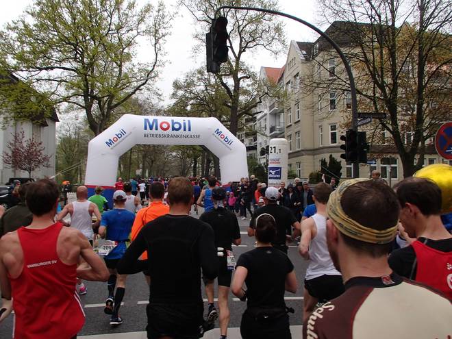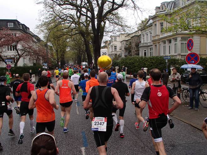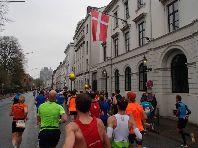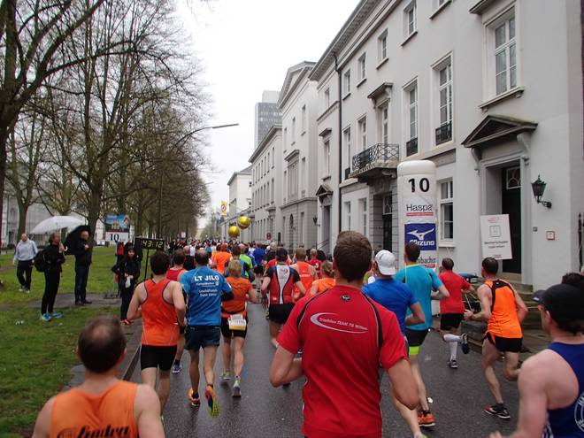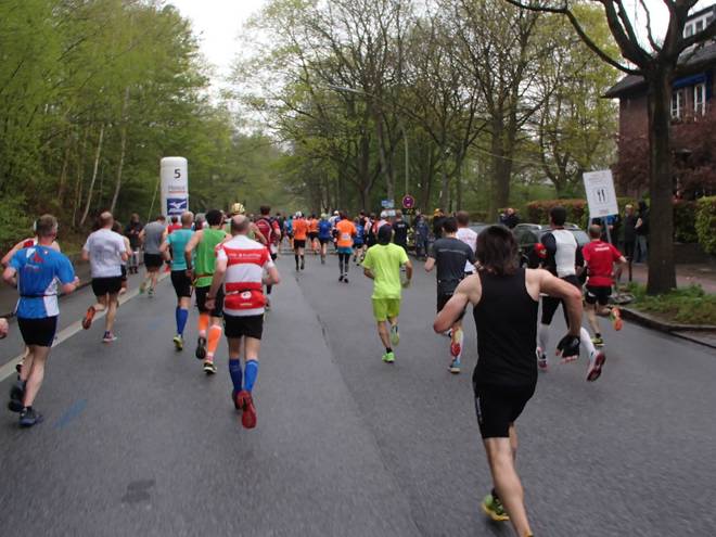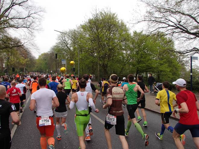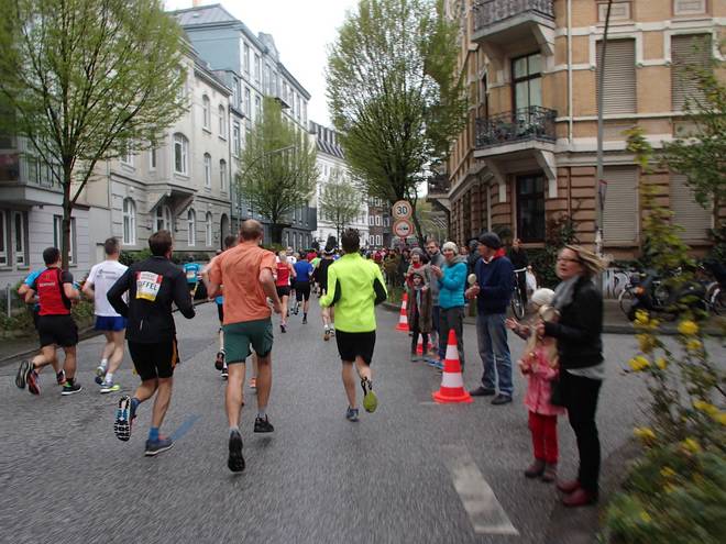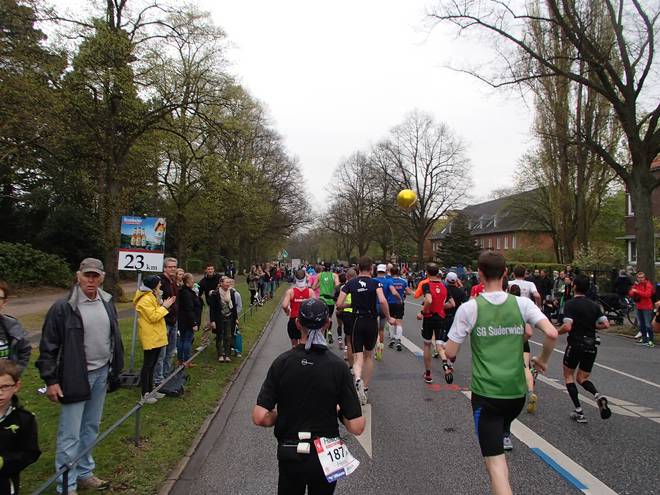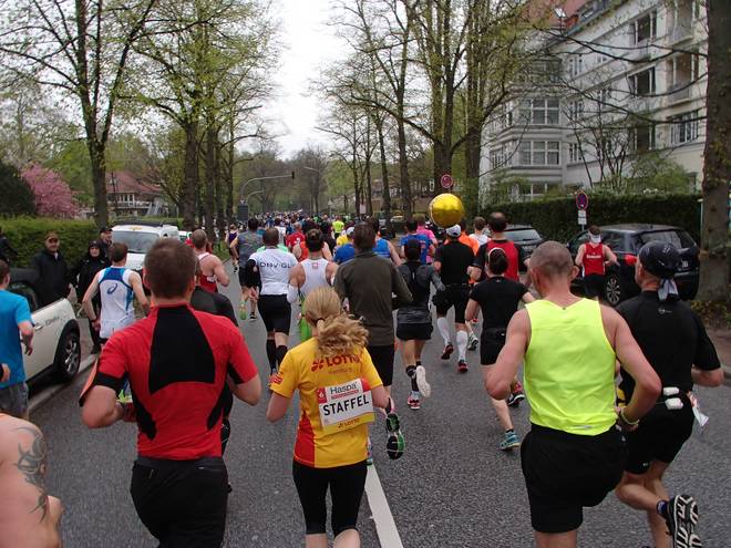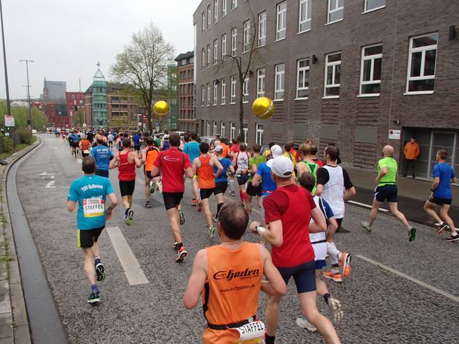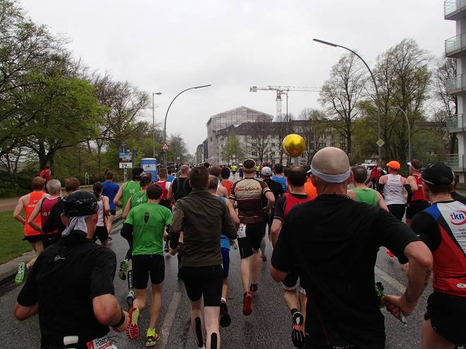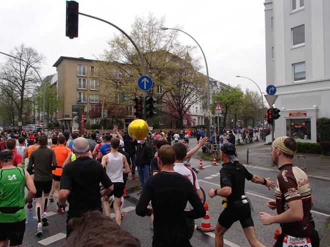 Klopstockstraße 9.41 Uhr / Km 9,5 Nun hatte ich gedacht, hinter den Ballons würde es etwas einfacher werden, das Tempo zu halten, zumal es ja etwas langsamer war. Aber das Gefühl hatte ich keineswegs. |