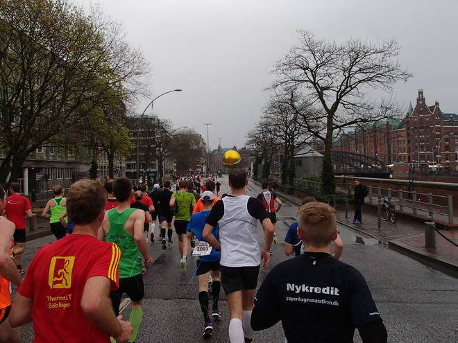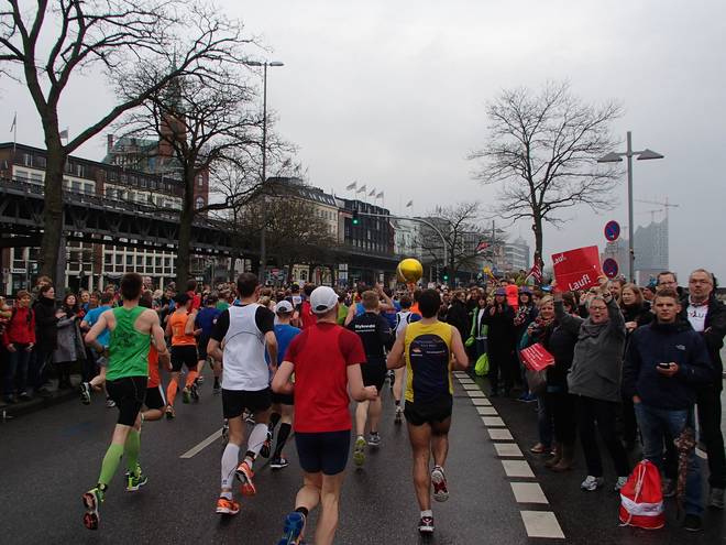 Bei den St. Pauli Landungsbrücken 9.52 Uhr / Km 12,0 Bei Kilometer 11 waren mir die Ballons erstmals enteilt. Einen Kilometer später hatte ich mich wieder herangelaufen. |
