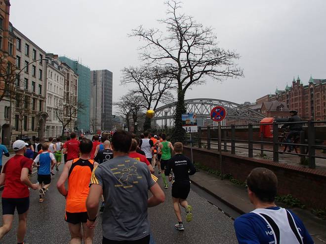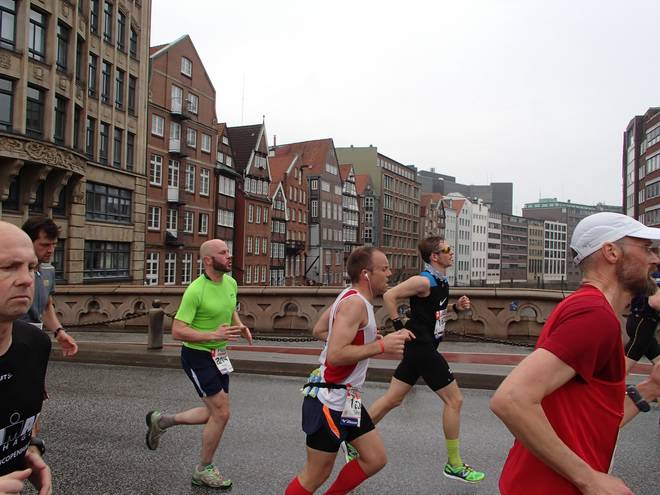 Hohe Brücke Nikolaifleet 9.57 Uhr / Km 13,0 Von der Idee, ich könne mich an die Hacken der Ballon-Läufer hängen und mich im Flow über die Strecke ziehen zu lassen hatte ich mich längst verabschiedet. |