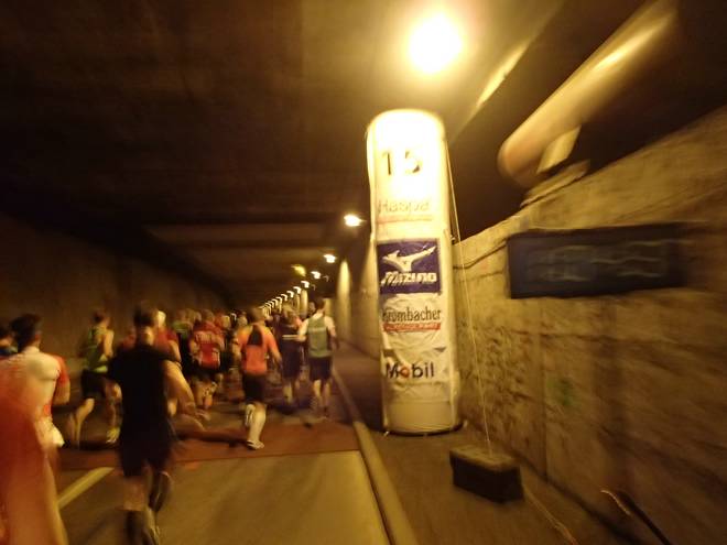 Wallringtunnel 10.04 Uhr / Km 15,0 1:03:26 Stunden. Also 21:24 Minuten für die dritten fünf Kilometer. Das war etwas zu langsam, allerdings nur neun Sekunden. Das lag aber zum Teil auch daran, daß ich mal wieder den Kontakt verlor. Hier auf dem Foto sieht man es schon. Im Rennen sah ich es noch nicht. |