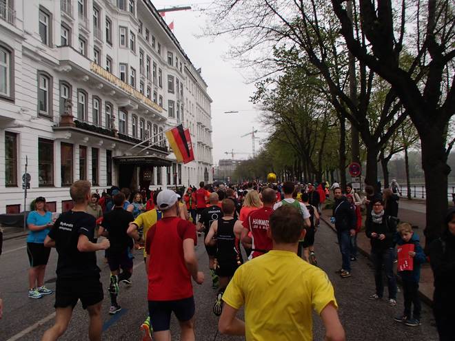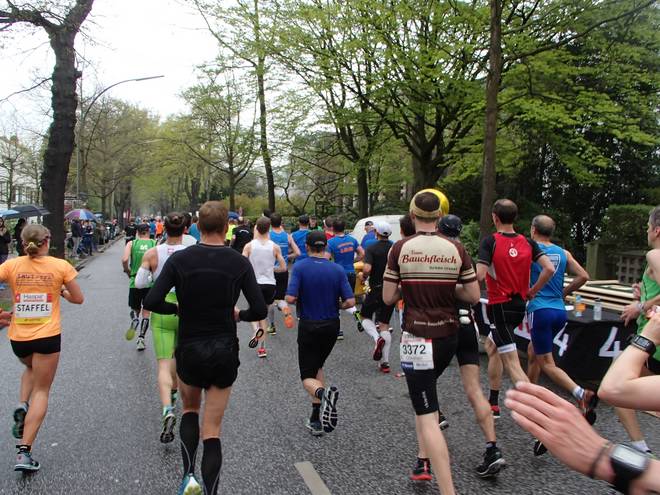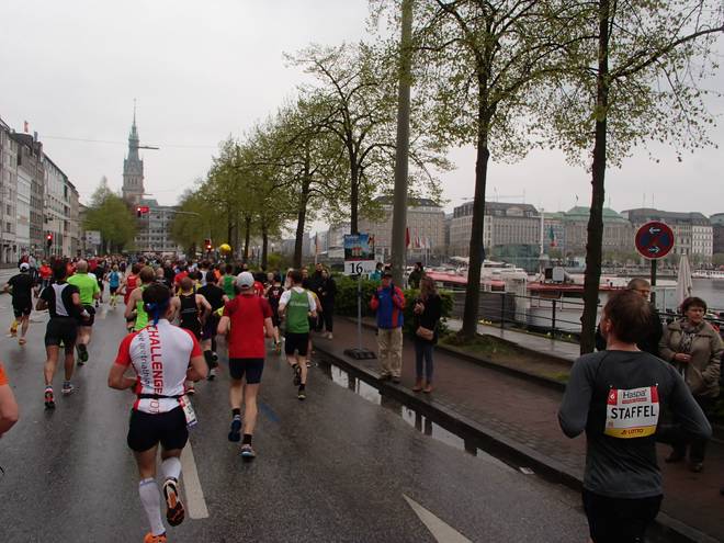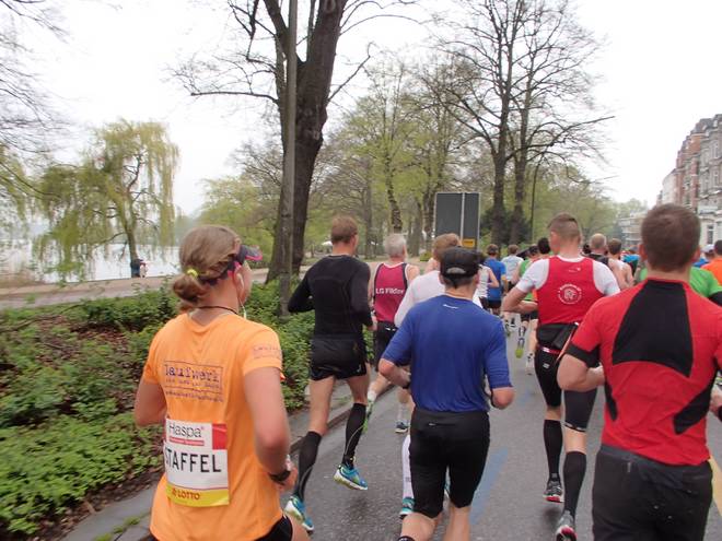 An der Alster 10.21 Uhr / Km 19,0 Da ich das Tempo nicht mehr selbst hochhalten konnte, hängte ich mich eine Weile an eine schnelle Staffelläuferin ran und ließ mich mitziehen. |