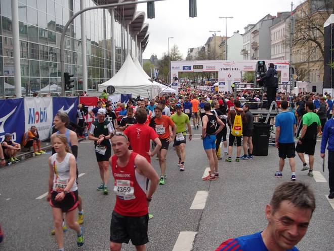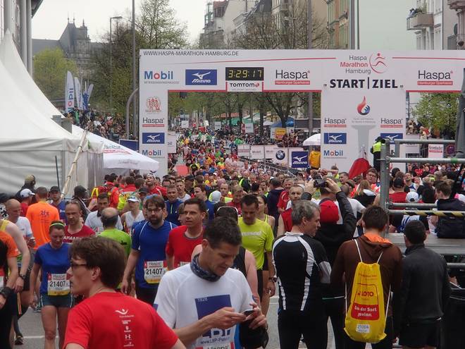 Karolinenstraße 12.29 Uhr / Km 42,195 3:26:43 Stunden hatte ich im Ziel auf der Uhr. Das war beim 15. Auftritt die drittschnellste Zeit, die ich in Hamburg lief. |