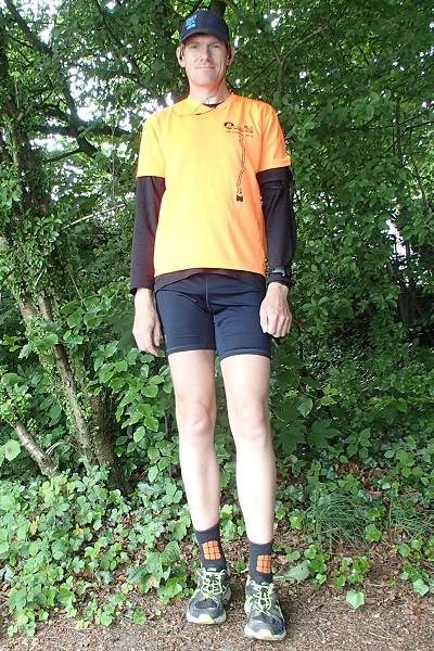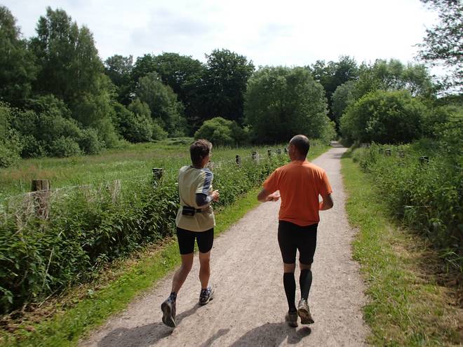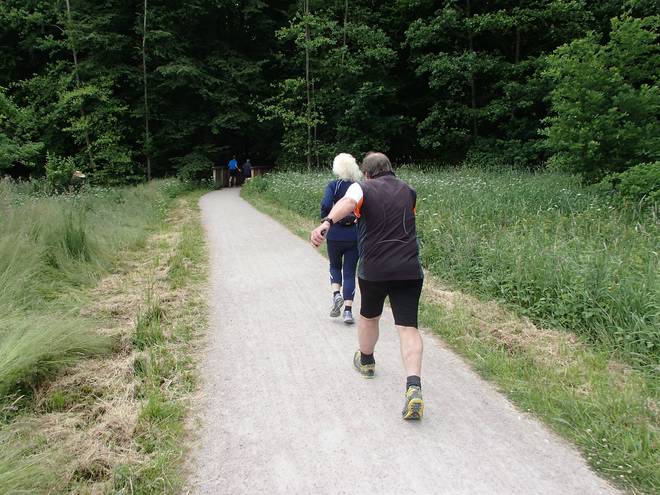 Auftakt 14.30 Uhr / Km 0,6 Am Anfang übernahmen Cornelia und Roman die Spitze des Feldes. Ich hatte reichlich Probleme, mit dem schmerzenden Fuß einen geordneten Laufstil zu finden. |
