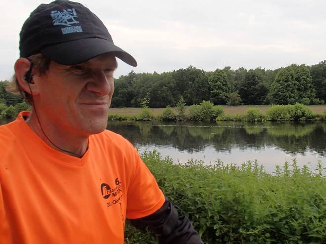 Runde 14 17.55 Uhr / Km 37,0 Ich hatte schon nach der Runde 8 mit dem Trinken begonnen. Das war recht früh für mich hier an den Teichwiesen. Vielleicht lag es an meinem leidenden Magen? Naja... Durchfall und Spuckreiz waren stetig präsent, aber schlimmer wurde das nicht. Reichte ja schon, daß ich am Verpflegungsstand vor Erschöpfung nicht richtig stehen konnte, weil mir der Kreislauf nicht gehorchen wollte. |
