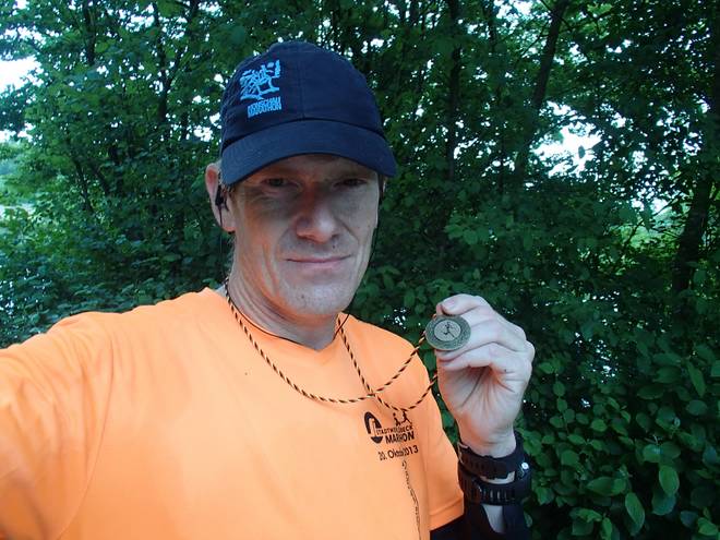 Finish 18.28 Uhr / Km 42,195 Geschafft. Am Ende dann 3:59:30 Stunden. Was habe ich im Ziel laut vor mich hin geflucht. Da kam ich mit kaputtem Fuß an und hatte damit kaum Probleme. Aber dafür tat mir alles andere weh. Der Magen, Knöchel, Darm, Leiste, Hüfte, Kopf... und trotzdem hatte ich mich mal wieder durchgekämpft. Und war sie dann: Meine Marathon-Medaille Nr. 146. |