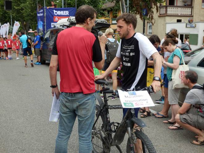 Maxi Kids Race ab 10 Jahre Wie auch bei den Läufen zuvor hatte der Moderator das Problem, daß er die Kinder ja gerne angekündigt hätte, aber die Namen nicht wußte. Tja... die Idee der einheitlichen Startnummer bringt auch seine Schwierigkeiten mit sich. |