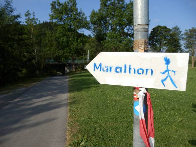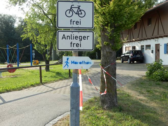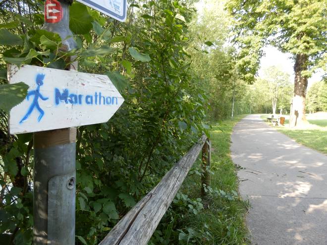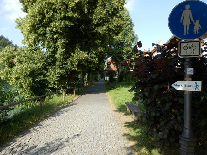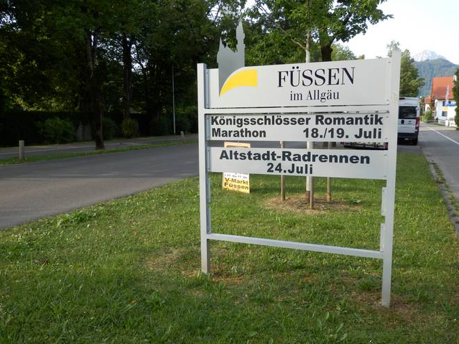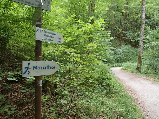 Fischersteig Richtung Schwansee Überall in Füssen und in der Umgebung hingen schon die Wegweiser für den Marathon. |