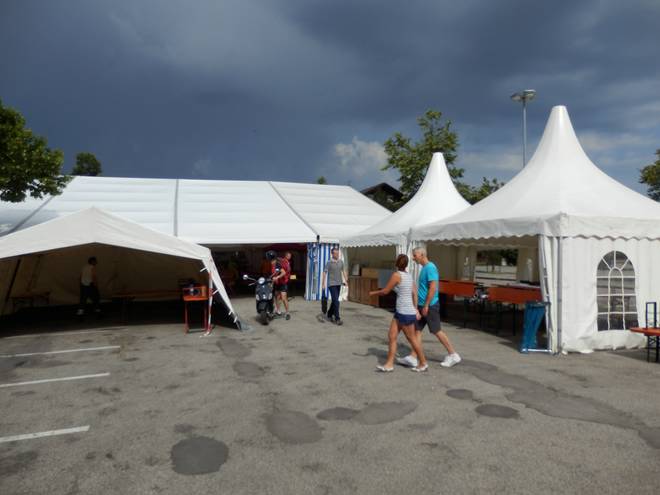 Parkplatz an der Morisse Drei Taschen mit Werbung plus Startunterlagen plus ein Shirt. Ging zum Glück alles schnell und ich schaffte es trocken bis in den Supermarkt und wurde erst auf dem Weg in meine Unterkunft naß. Bis zum ersten Wettbewerb war es dann aber wieder trocken und kühler wurde es auch nicht. Nur noch schwüler... |
