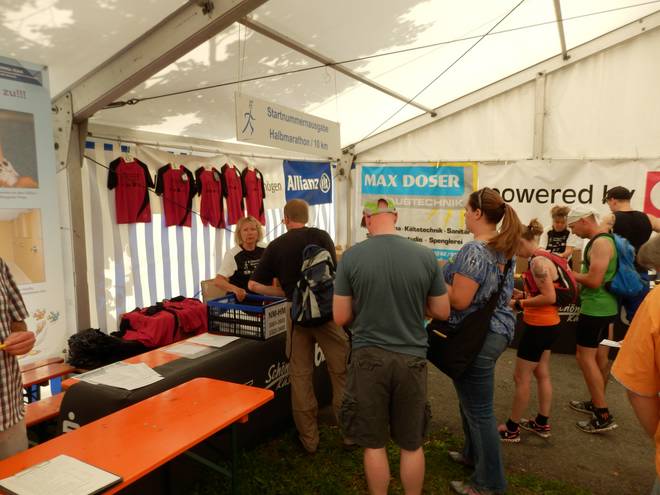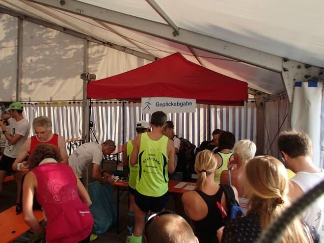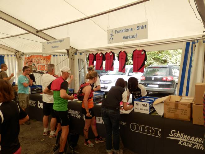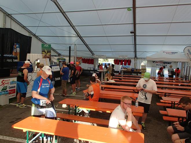 Parkplatz an der Morisse Bei heißen 29°C und einem aufziehenden Gewitter holte ich mir schnell meine Unterlagen ab. Zu diesem Zeitpunkt waren es noch rund fünf Stunden bis zu den ersten Kinderläufen und rund sieben Stunden bis zum Zehn-Kilometer-Lauf. |