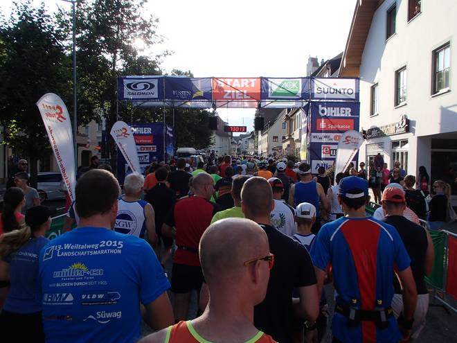 Kemptener Straße 7.30 Uhr Und los ging es. 480 Läufer machten sich auf die Strecke. Für mich war es der Start zu meinem 150. Marathon. |