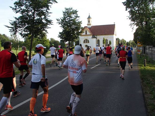 Augsburger Straße 7.33 Uhr / Km 0,5 Dafür nutzt man die B16 nach Norden. Das ist nicht gerade die hübscheste Straße, aber man konnte auch im Pulk gut drauf laufen |