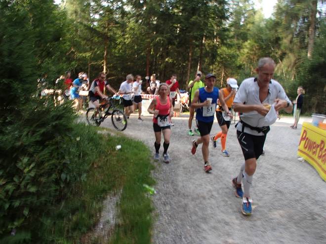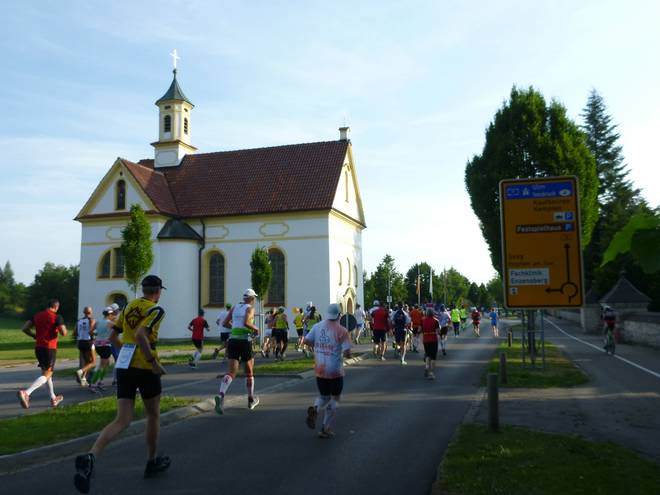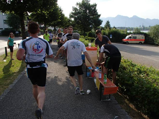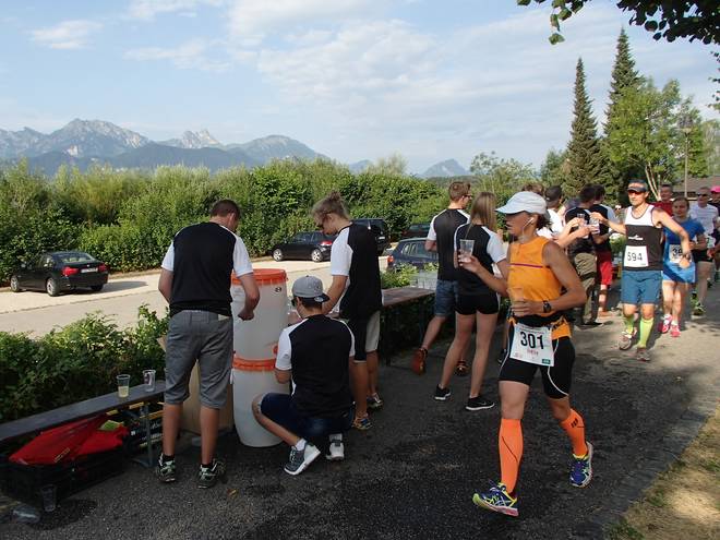 Eschach 7.53 Uhr / Km 4,1 Alle fünf Kilometer gab es eine Verpflegungsstelle und dann ab Kilometer 17,5 zusätzlich eine Wasserstelle dazwischen. Die erste Verpflegung kam etwas früh, aber besser so als nie. |