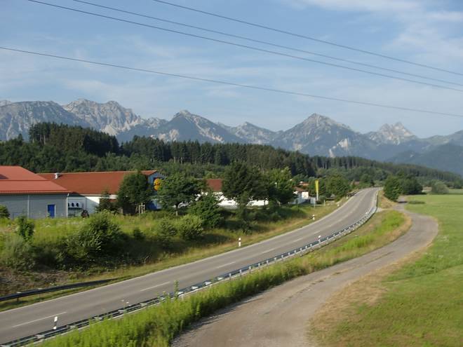 Hopfener Straße B310 7.42 Uhr / Km 2,3 Von der Brücke über die B310 eröffnete sich dann erstmals der Panoramablick über die Tannheimer Berge. Für einen Norddeutschen ist das schon ein imposanter Anblick. |