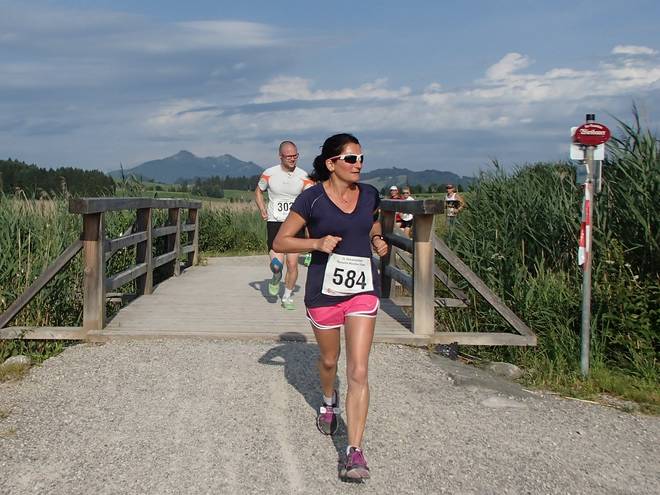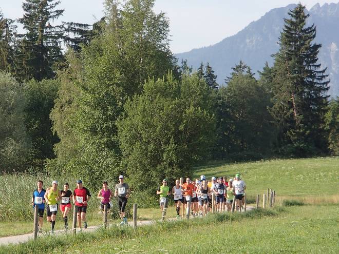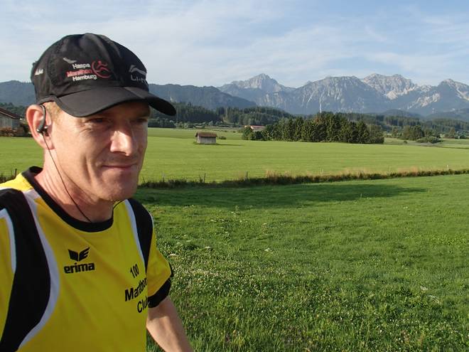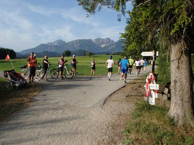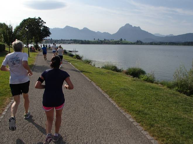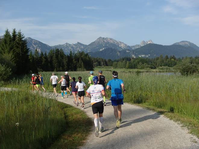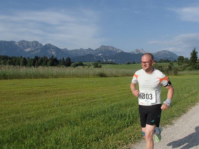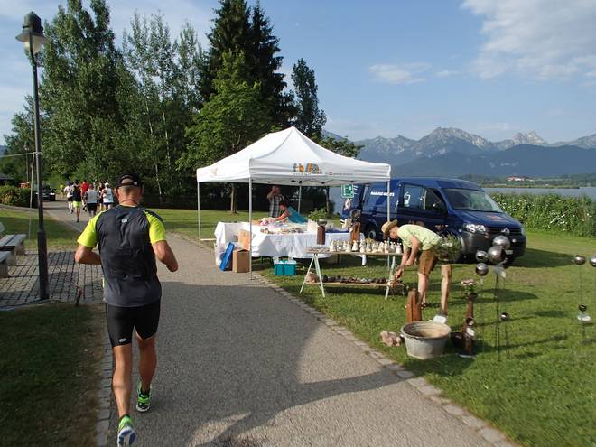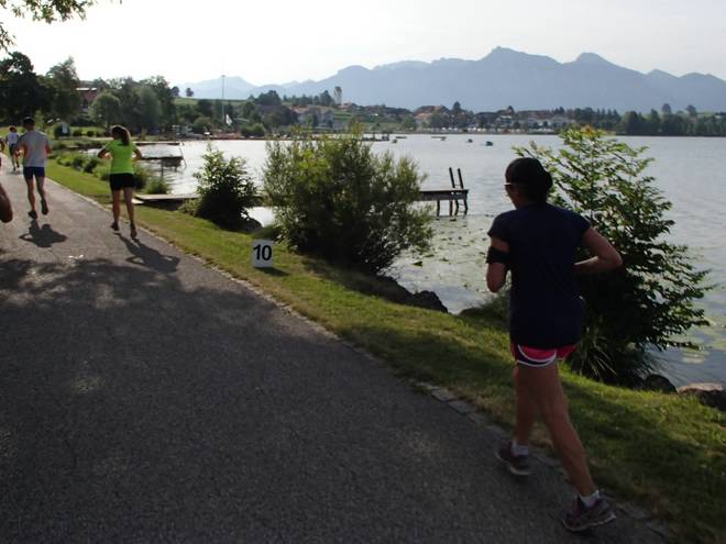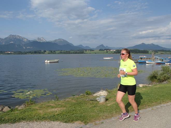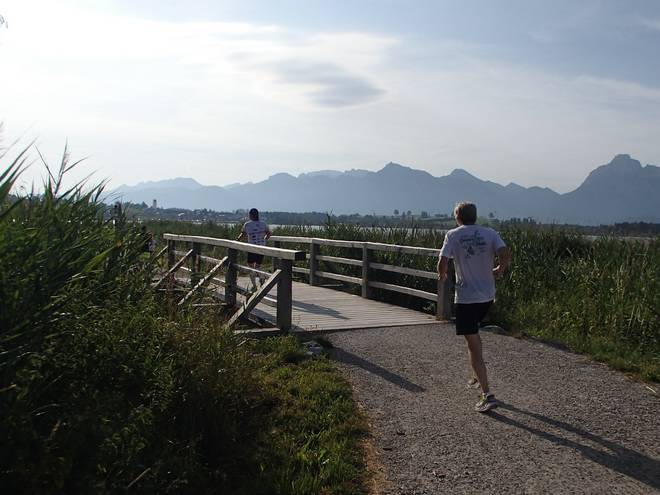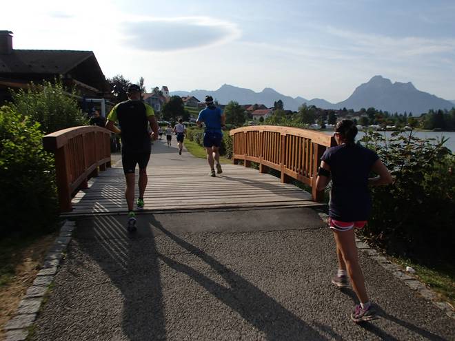 Hopfensee Rundweg 8.10 Uhr / Km 7,4 Eigentlich war ich mehr am die Umgebung genießen als am Laufen. Und nebenbei suchte ich immer nach dem nächsten Fotomotiv. Irgendwo konnte sich immer ein toller blick auf die Berge oder den Hopfensee ergeben. |