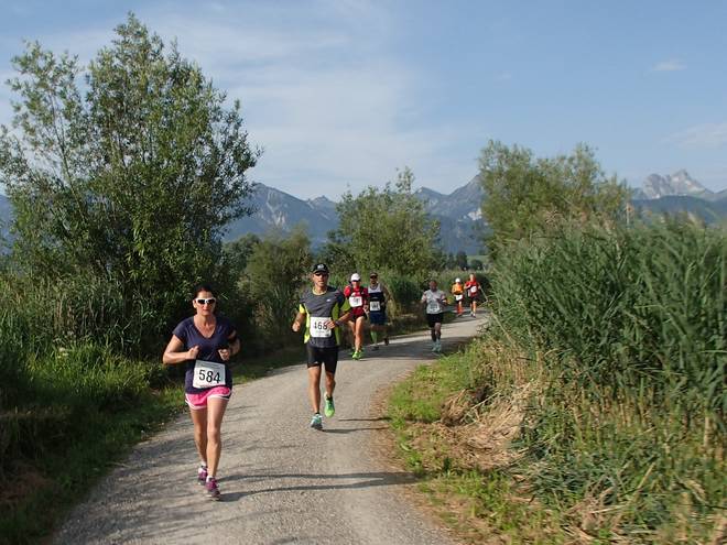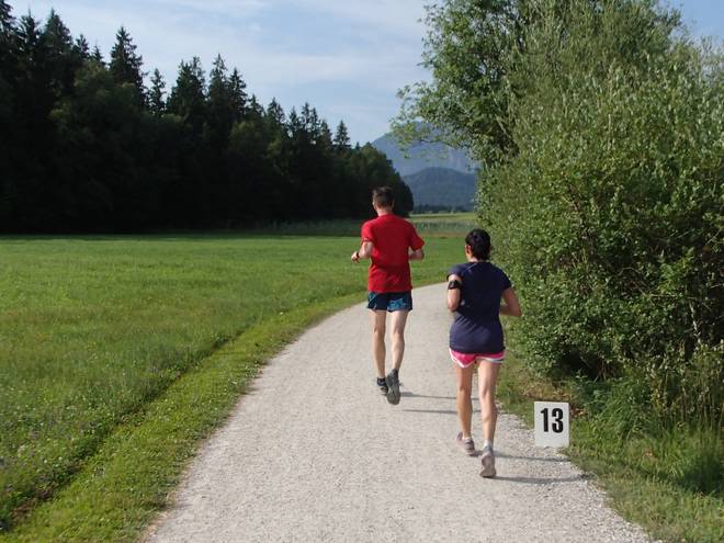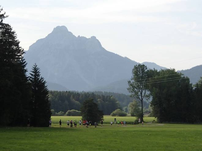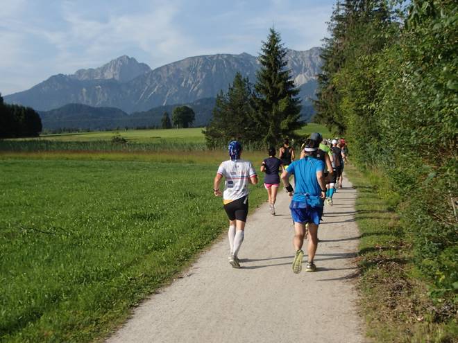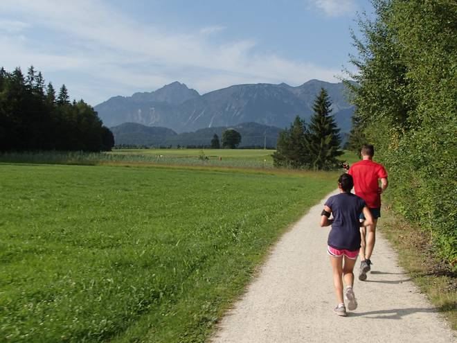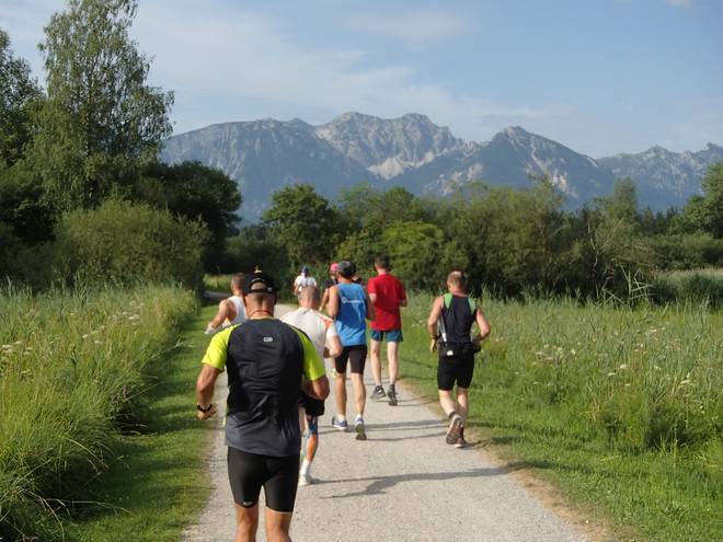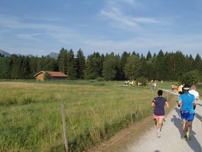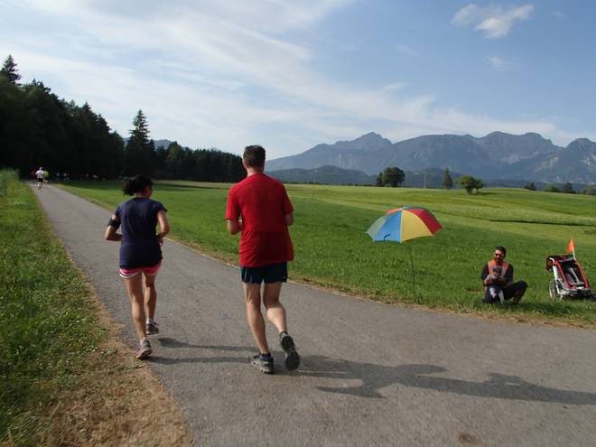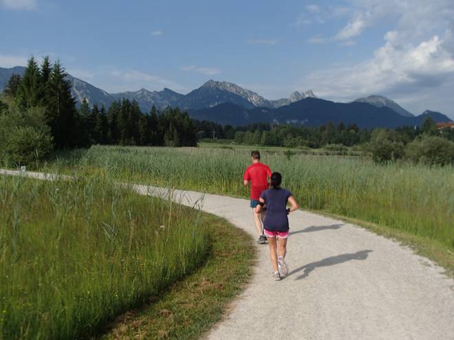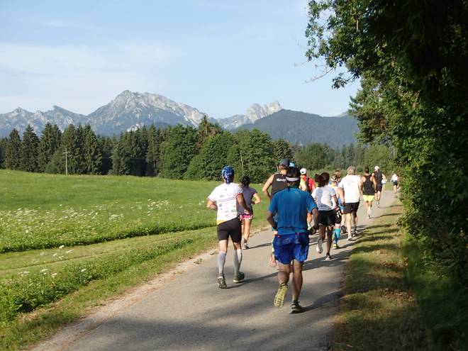 Füssener Achen 8.44 Uhr / Km 13,5 Bis nach Füssen sollten wir noch etwas zu laufen haben, aber den Blick in Richtung Ammergauer Alpen und somit in Richtung der berühmten Schlösser konnten wie schon genießen. |