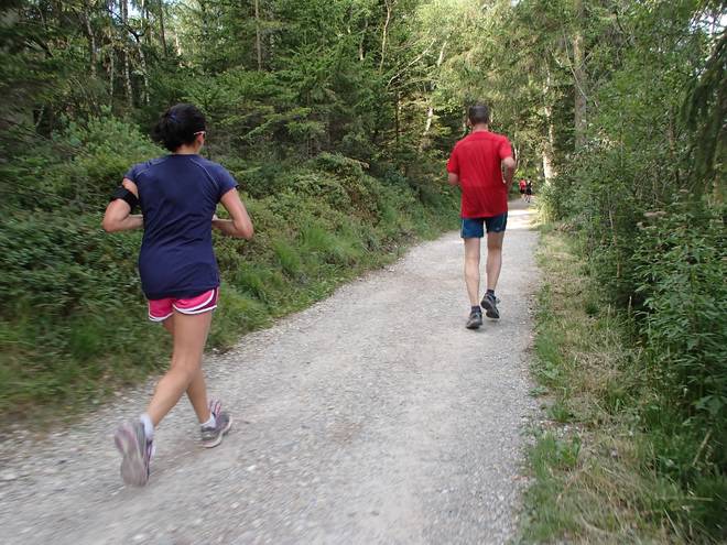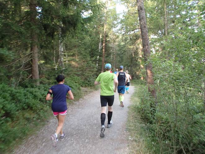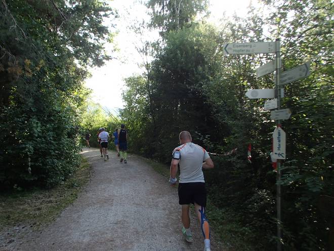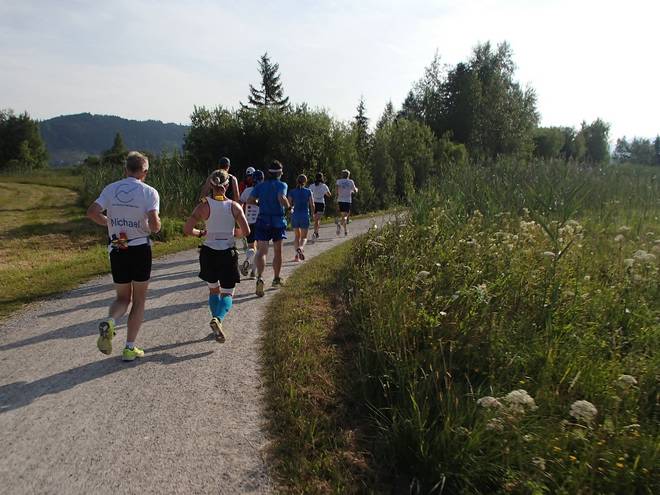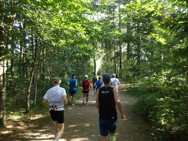Hopfensee Rundweg 8.11 Uhr / Km 7,5 So lief ich ziemlich unruhig. Mal etwas langsamer, dann wieder etwas schneller. Es war immer wieder dieselbe Gruppe Läufer, die ich überholte und die ich beim Fotografieren überholen ließ. |