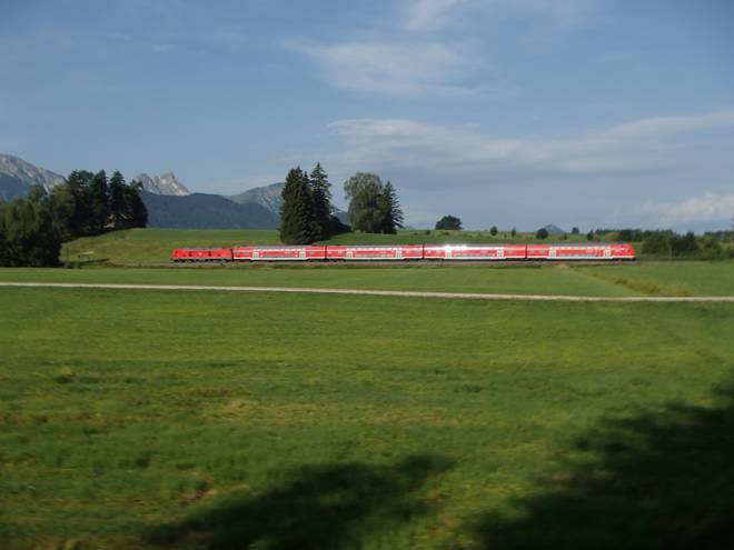 Hopfensee Rundweg 8.12 Uhr / Km 7,7 Der Zug zwischen Füssen und Augsburg. Den würde ich am Nachmittag auch noch nehmen müssen. |