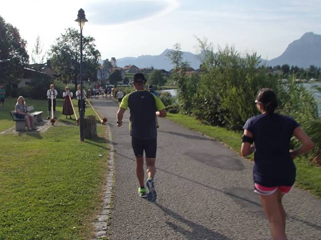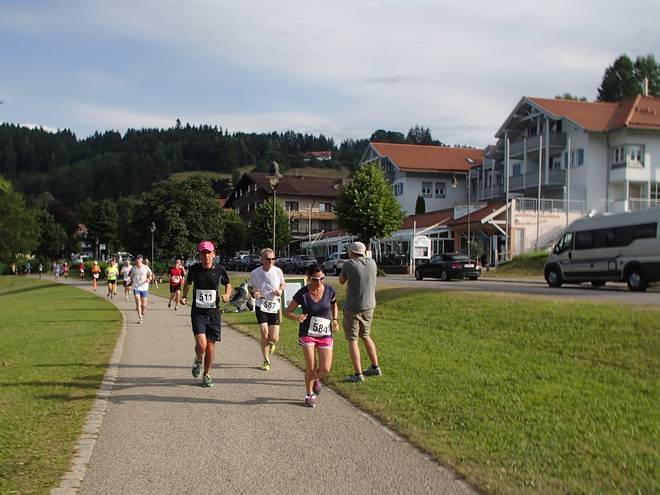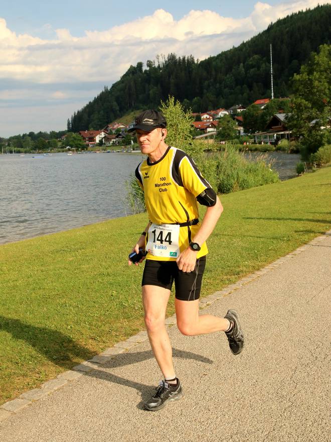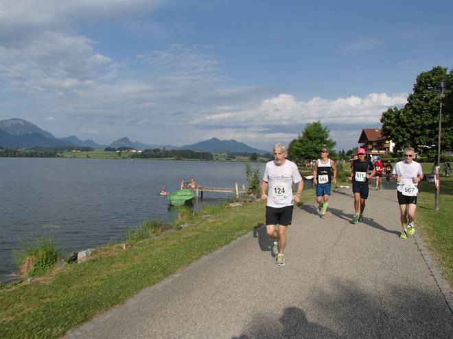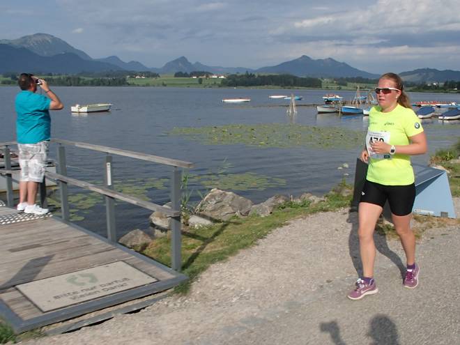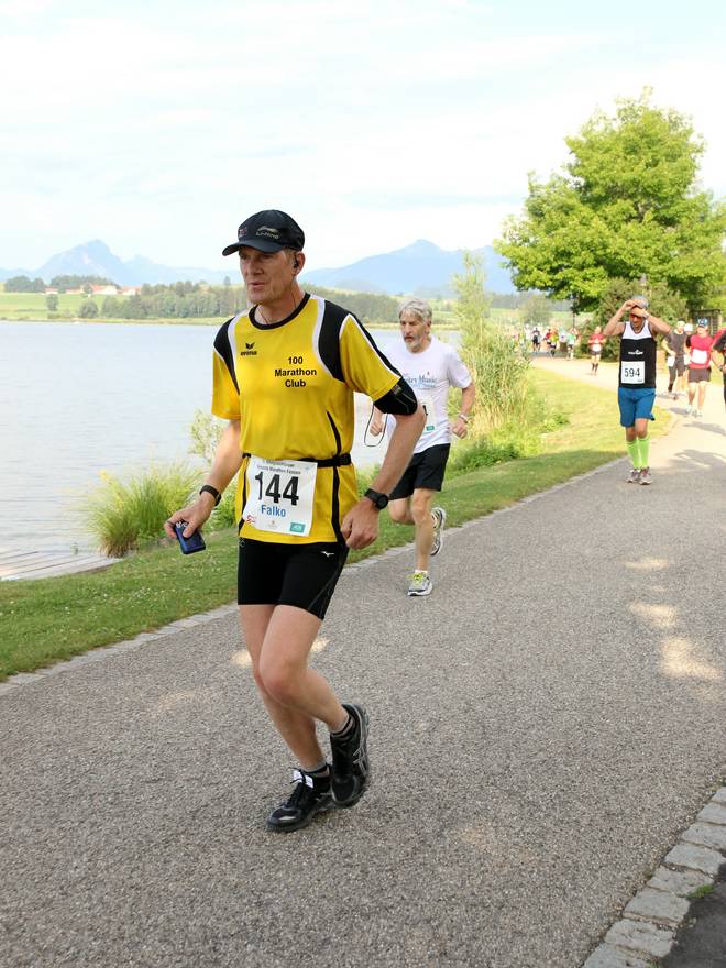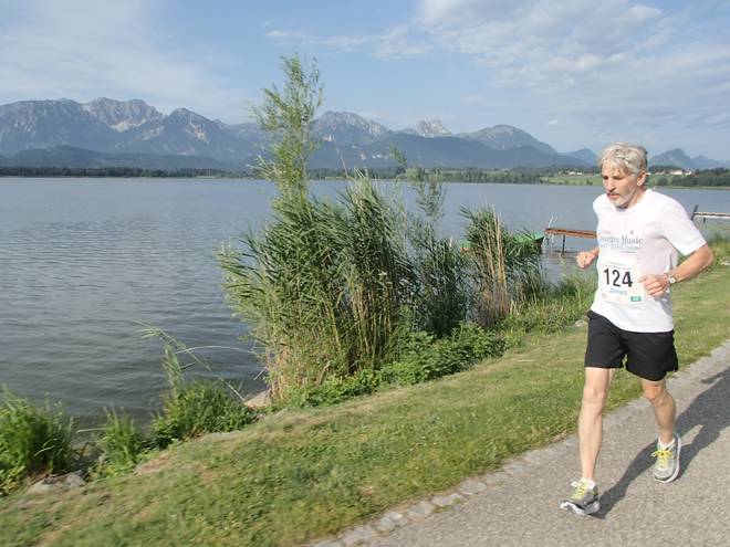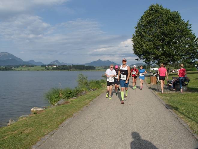 Hopfensee Rundweg Uferstraße 8.25 Uhr / Km 10,1 Mir war schon klar, daß die Probleme noch kommen würden. Zuviel war ich an den Vortagen gelaufen. Es waren 101,5 Wochen-Kilometer schon vor dem Marathon-Start. Dazu noch stundenlanges Füssen-Sightseeing. Foto: Foto-Team-Müller |
