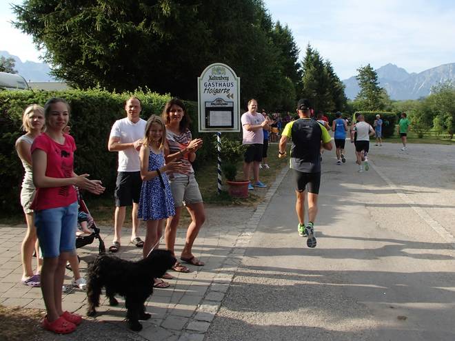 Hopfensee Rundweg Fischerbichl 8.31 Uhr / Km 11,1 Achtung, Hund an der Strecke. Die aufkommende Panik wurde auch nicht von den netten Zuschauern ausgeglichen. |