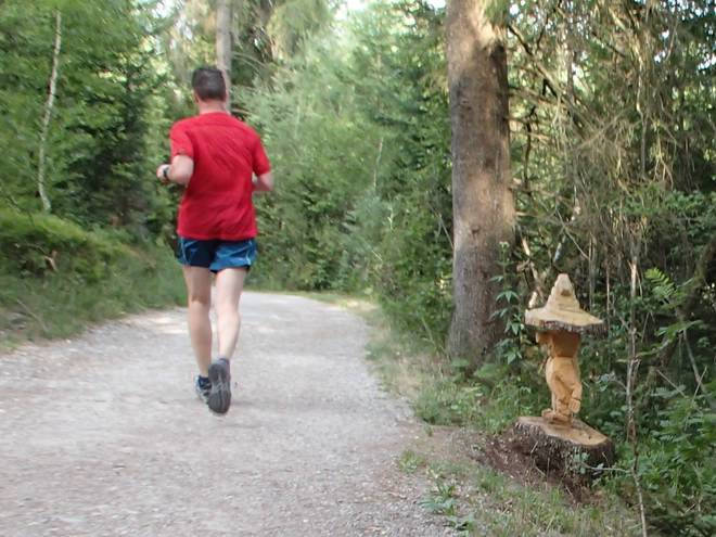 Hopfensee Rundweg 7.56 Uhr / Km 4,7 Schließlich erreichten wir den Hopfensee. Wer genau schaut und etwas Fantasie mitbringt, kann durch die Bäume durch Wasser erkennen. Kilometer 5 dann nach 27:06 Minuten. |