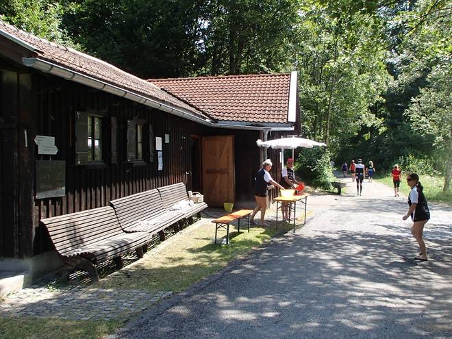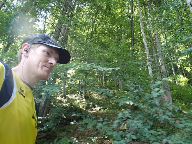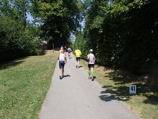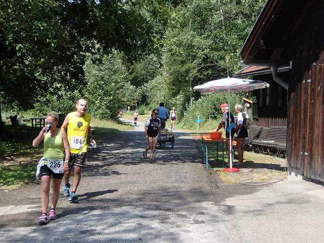 Schwansee 11.25 Uhr / Km 37,9 Schon am Freitag war der Übergang vom Wald auf die sonnige Freifläche wie ein Schlag mit der Baseball-Keule. Da war es mit stickigen 29°C sogar noch ein Grad wärmer, aber den Unterschied spürte ich nicht. |