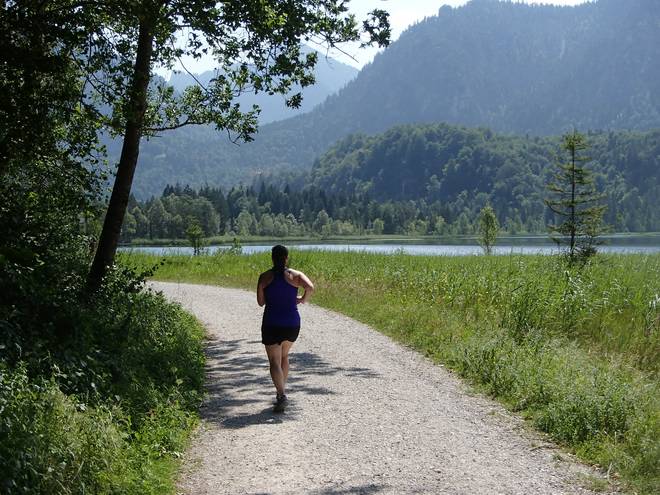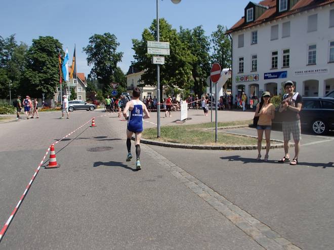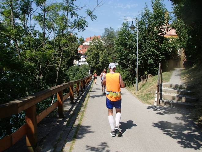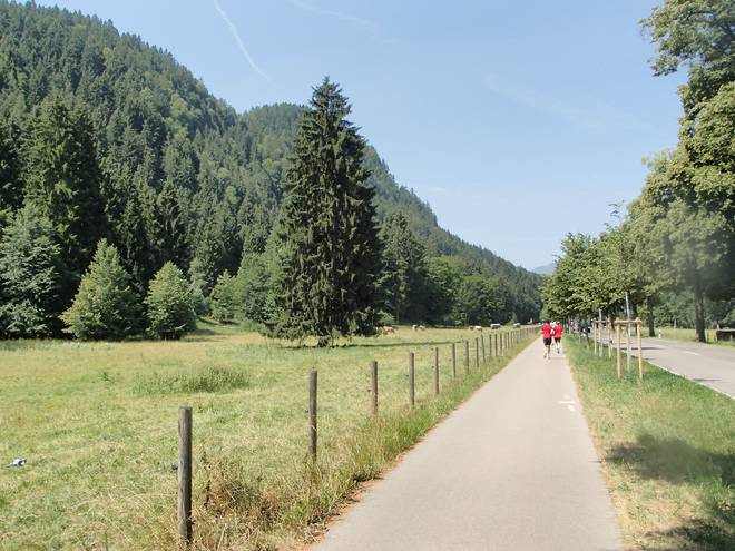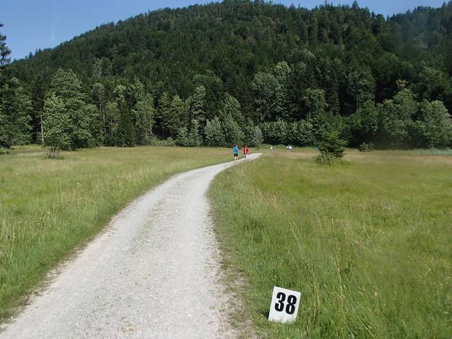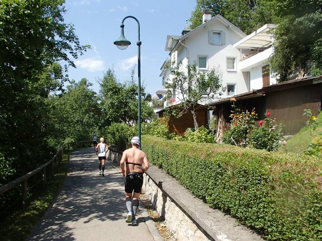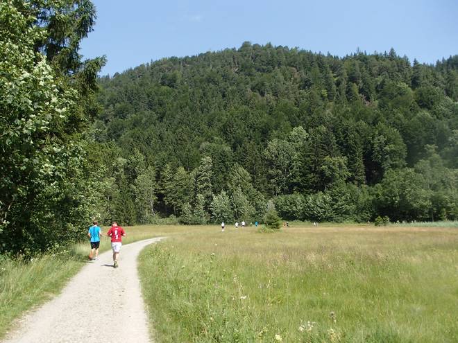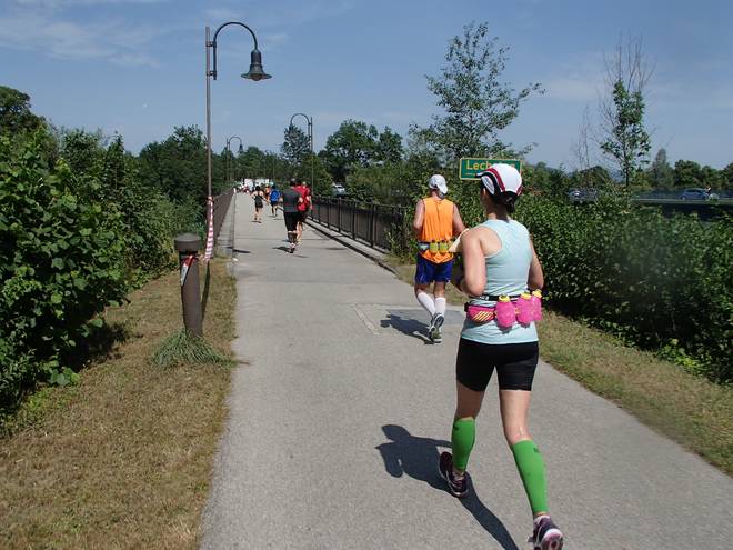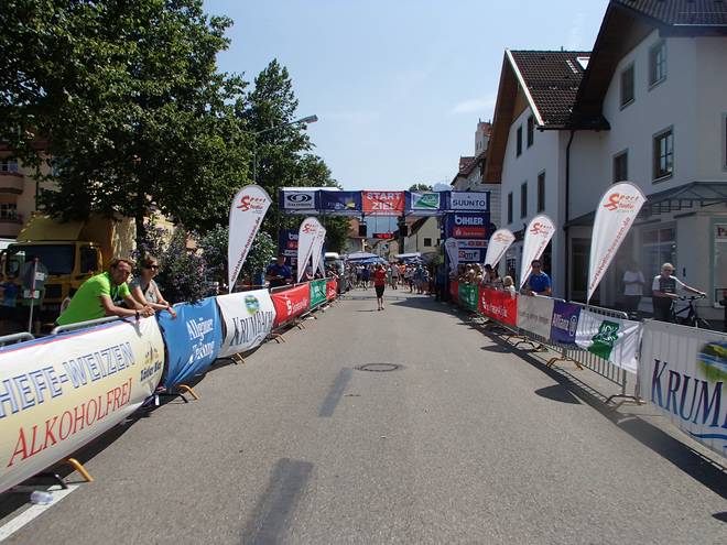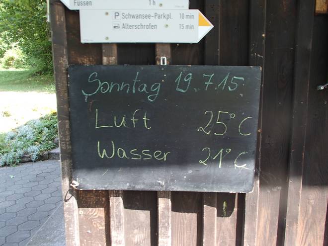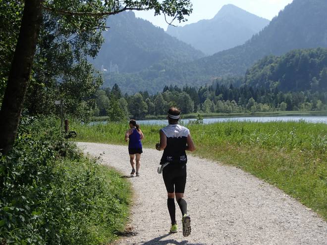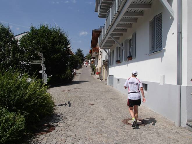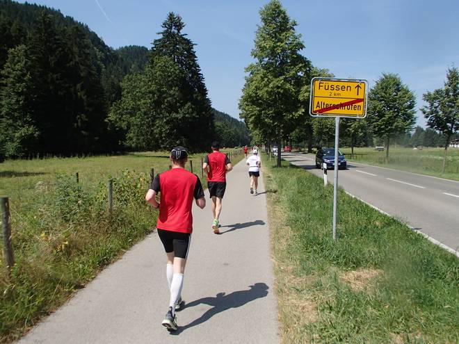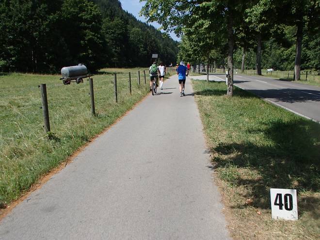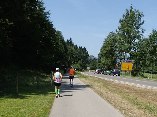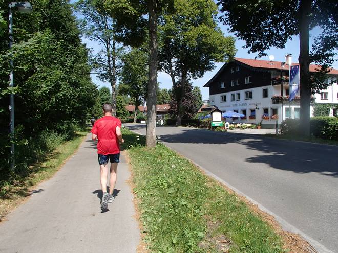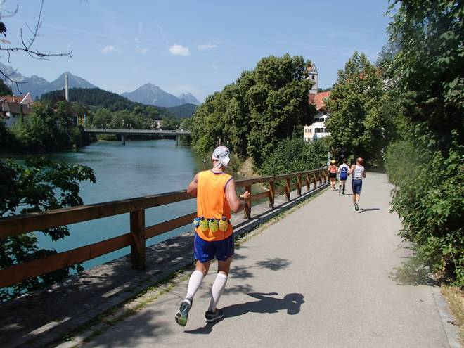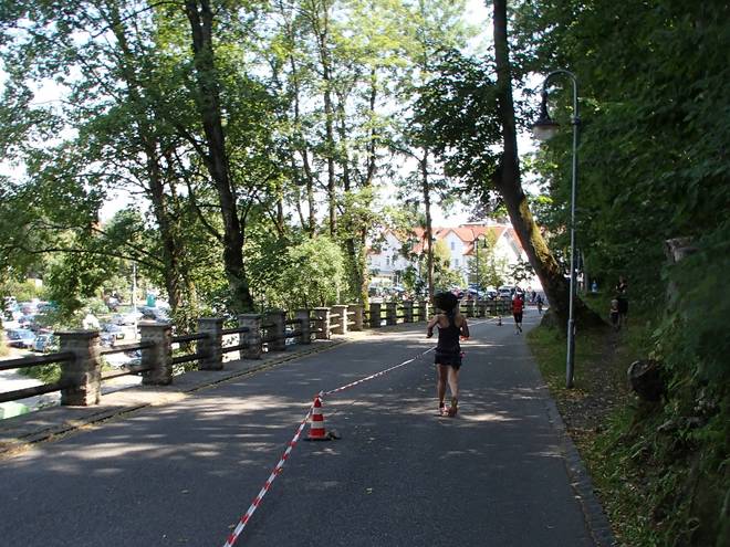 Schwansee 11.25 Uhr / Km 38,0 In der drückenden Hitze waren selbst 4,195 Kilometer eine echte Herausforderung. Zumal ich vom Freitag den Weg nach Füssen kannte. Und der war kürzer als der Marathon-Kurs. Allerdings war der Marathon-Kurs ohne Höhenmeter. |