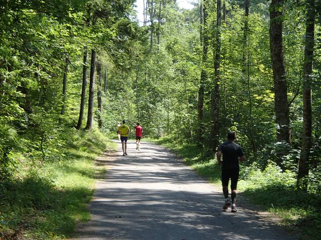 Schwansee 11.20 Uhr / Km 37,2 Zwischen Kilometer 36 und 38 versuchte ich es noch ein paar Male mit leichtem Joggen. Im Schatten klappte das recht gut, aber nie sehr lange. |
