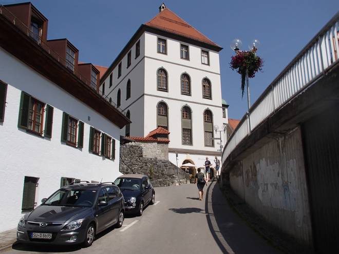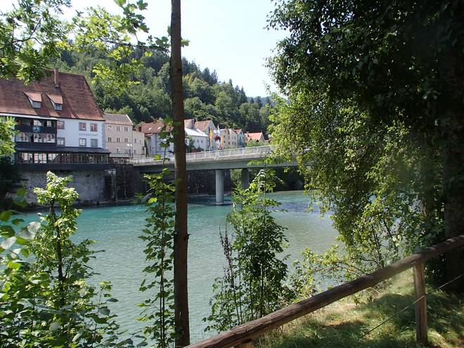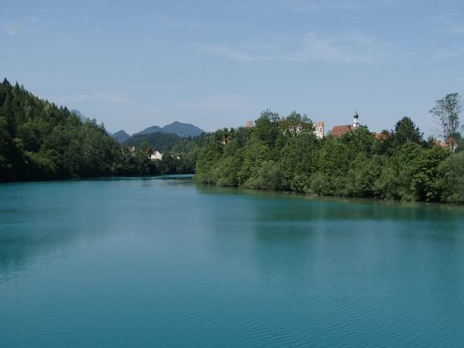 Lechsteg 11.48 Uhr / Km 40,6 Die Lech hat eine wirklich schöne Farbe. Rechte Seite das Franziskanerklosters und das Hohe Schloß Füssen. |